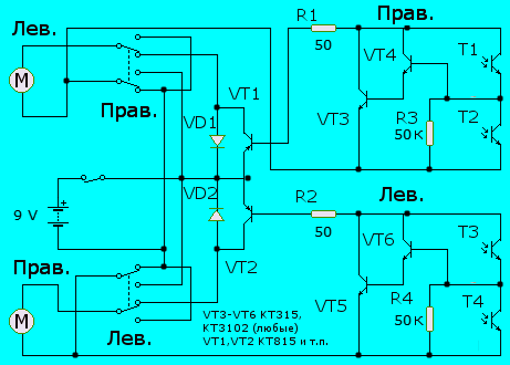 Схемка реализует движение на свет, остановку в световом пятне,обход препятствий за счет реверса двигателя (танковый разворот).