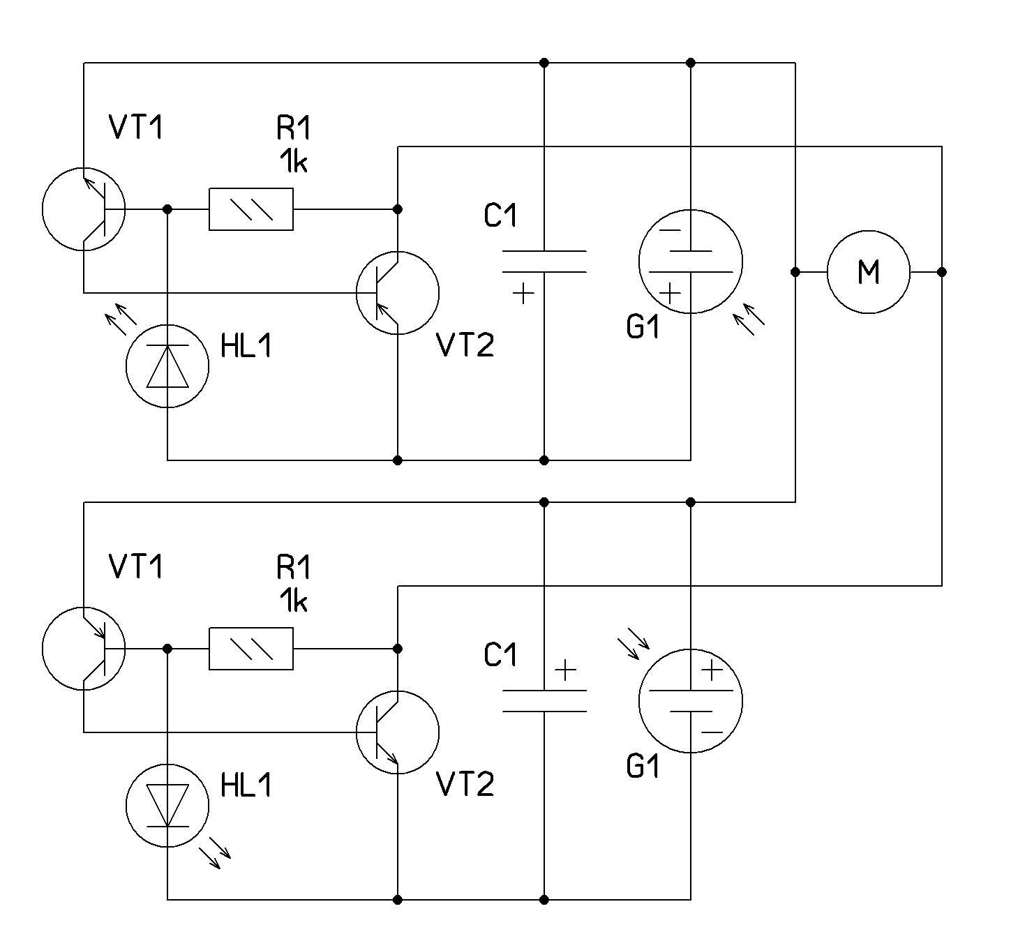 Не знаю, в соседней теме Дмитрий откликается,здесь нет. Пару месяцев назад макетировал такую схему:когда фототранзистор освещён, периодически срабатывает только М2, при затемнении фототранзистора - периодически срабатывают М1 и М2.
