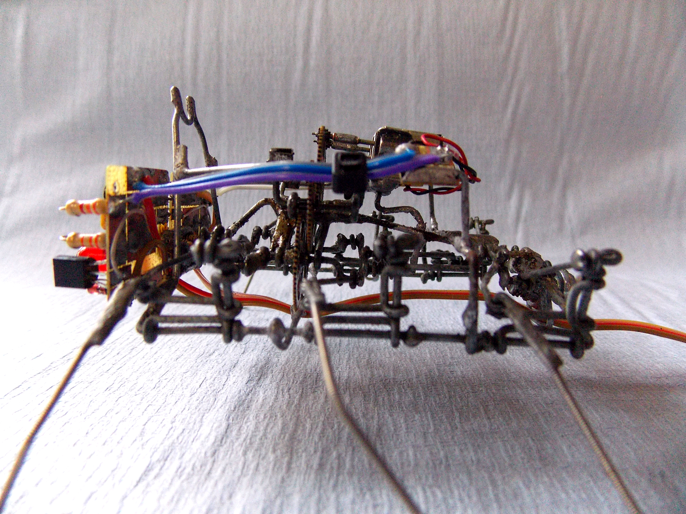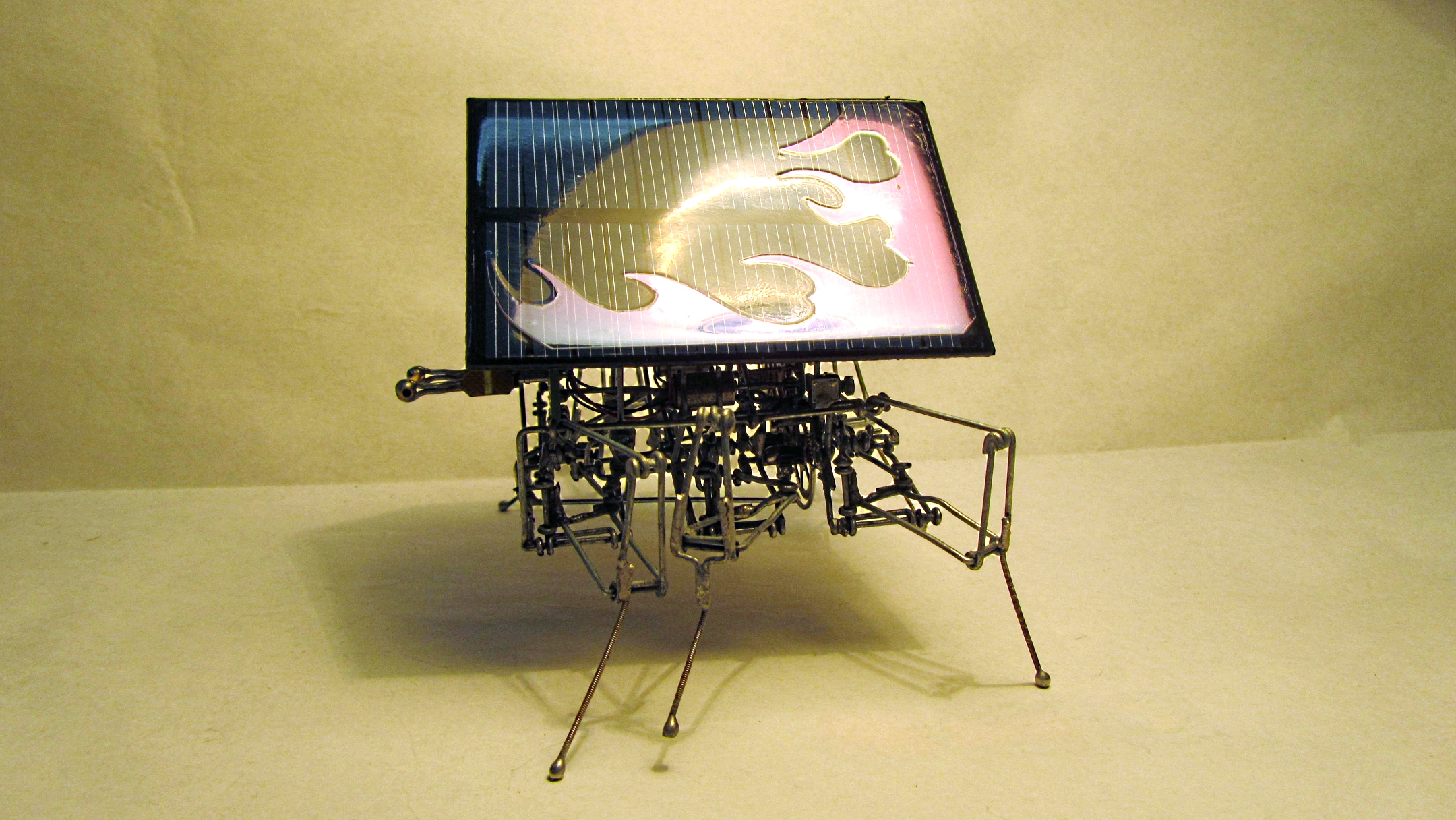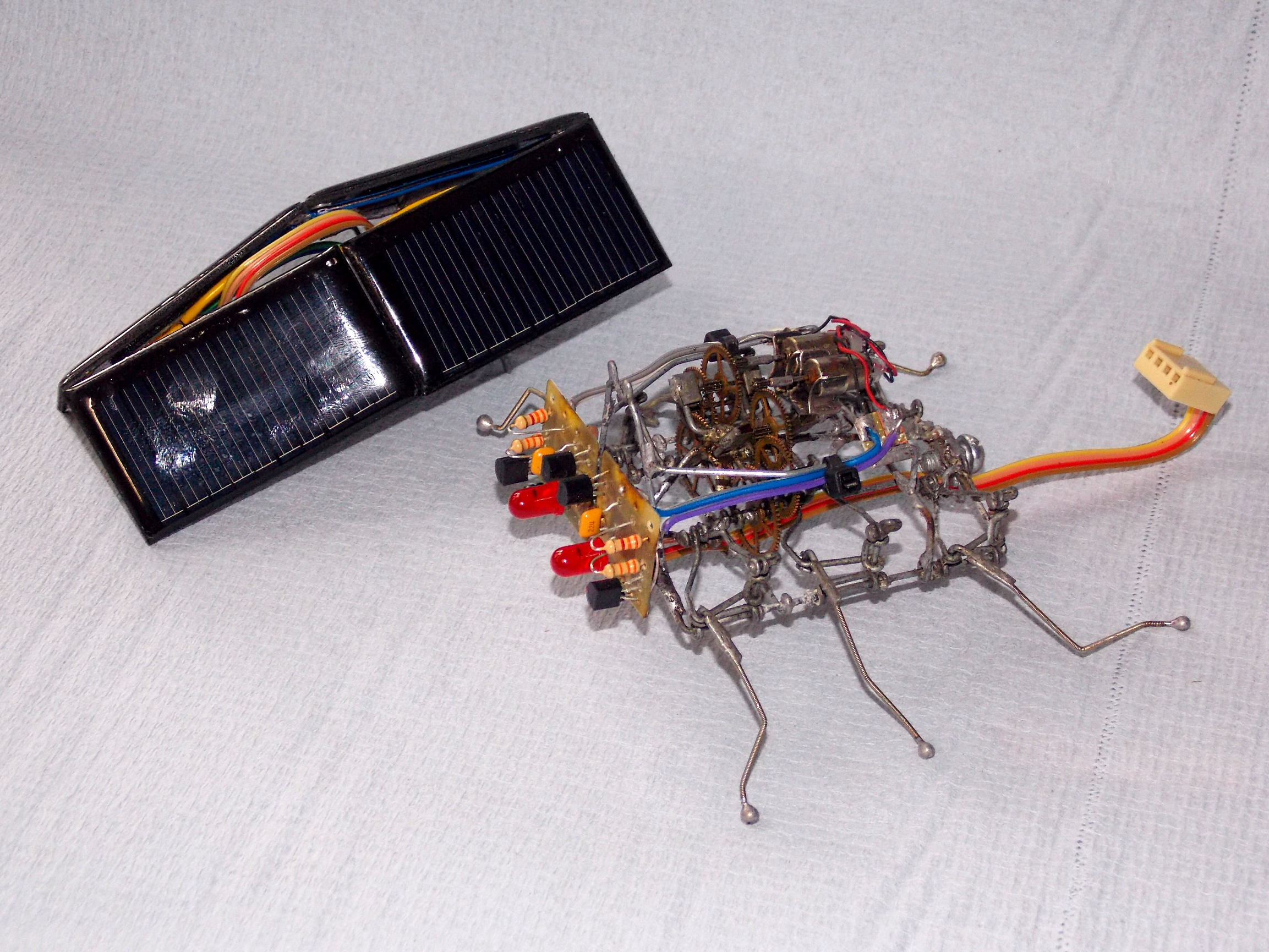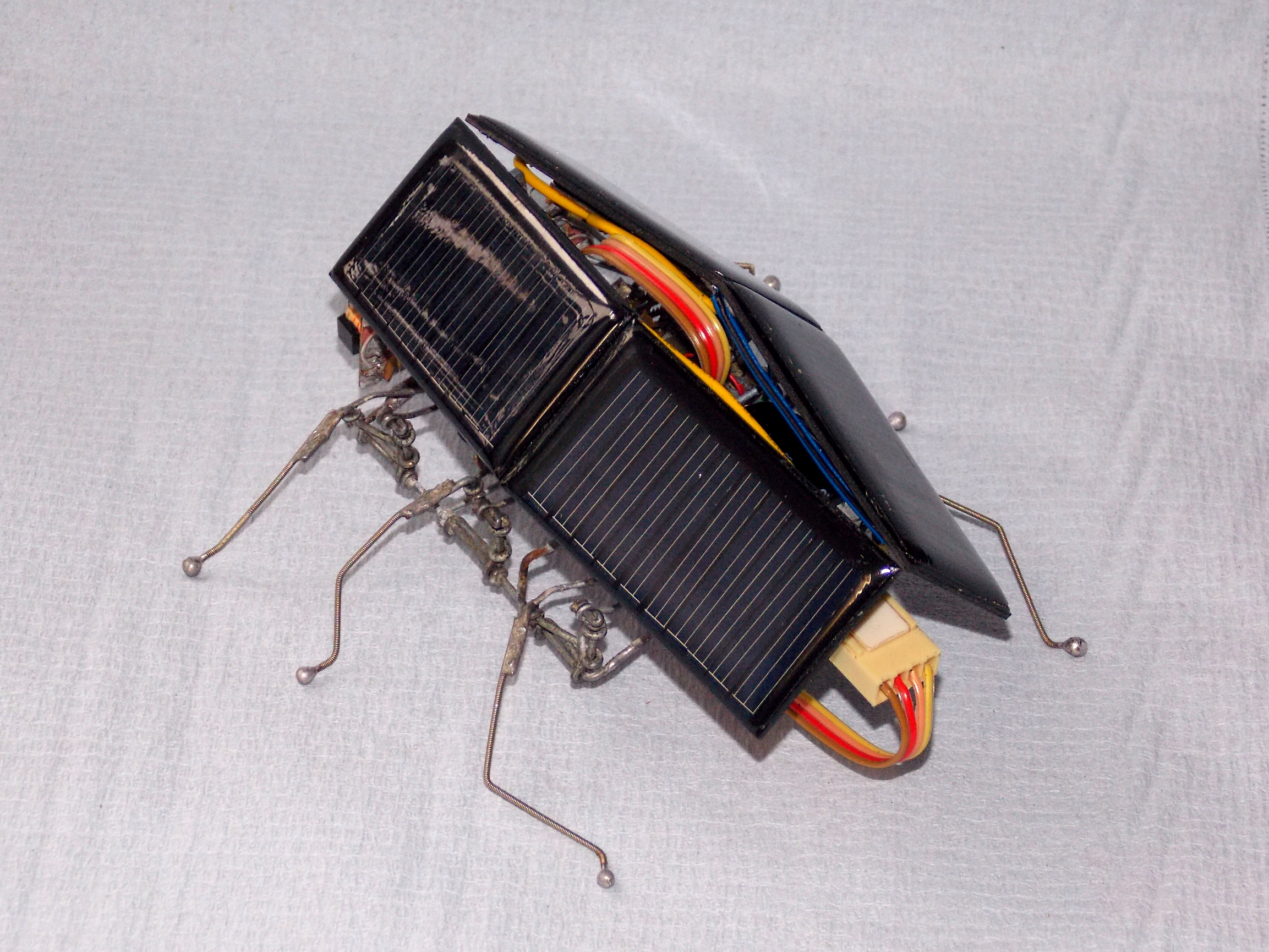Зачем-то докопался до старенького обновлённого Странника. Как ни крути, а он всё же весьма тормозноват и скучен, даже для бима, но при этом обладает весьма симпатичной и надёжной ходовой. А посему я его "разобрал-собрал-свинтил-смонтировал". Поставил другие, настроенные на вольтаж повыше мозги (поглумился над "печатными" платами), добавил ещё панелек, придал жукообразности.. По внешнему виду естественным образом стало вырисовываться нечто похожее на созданного разумными роботами разумного робота из фильма "Страховщик" (Autómata), что само по себе довольно неплохо. От туда и новое имечко: