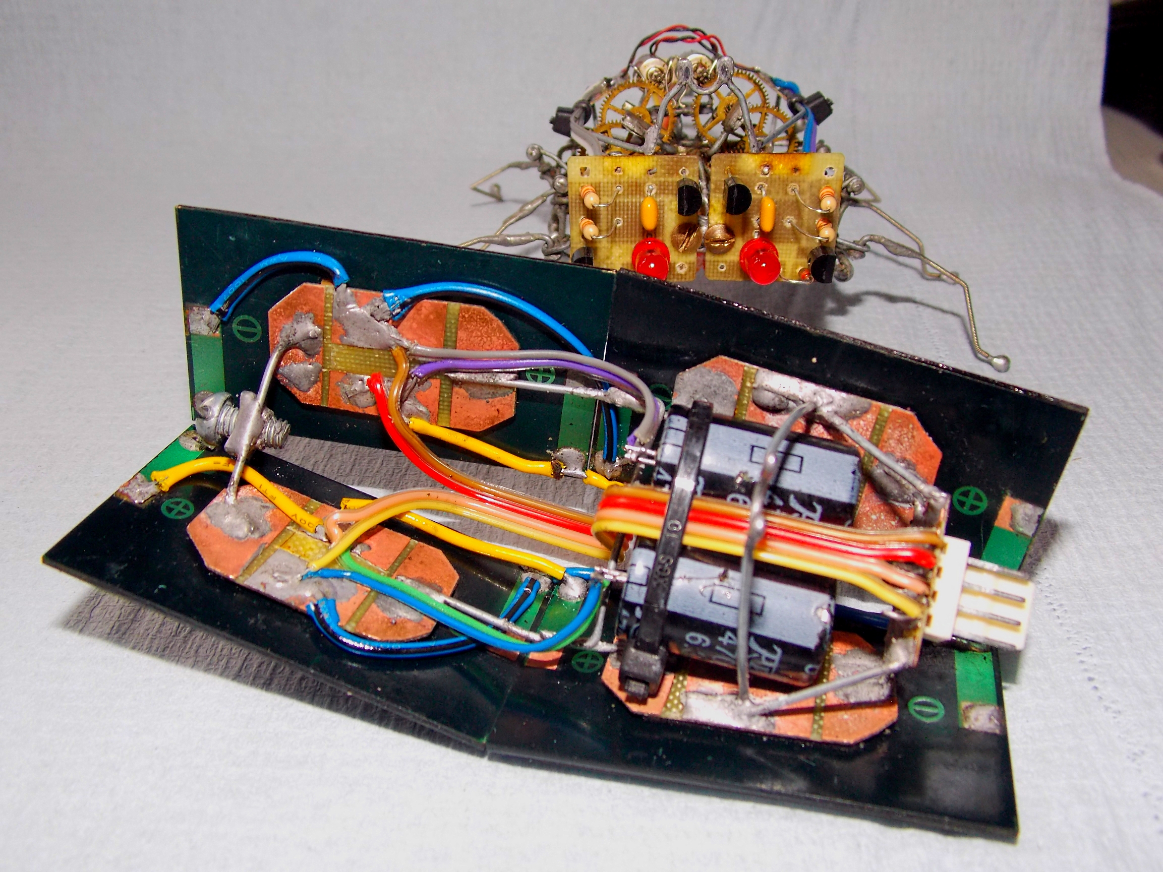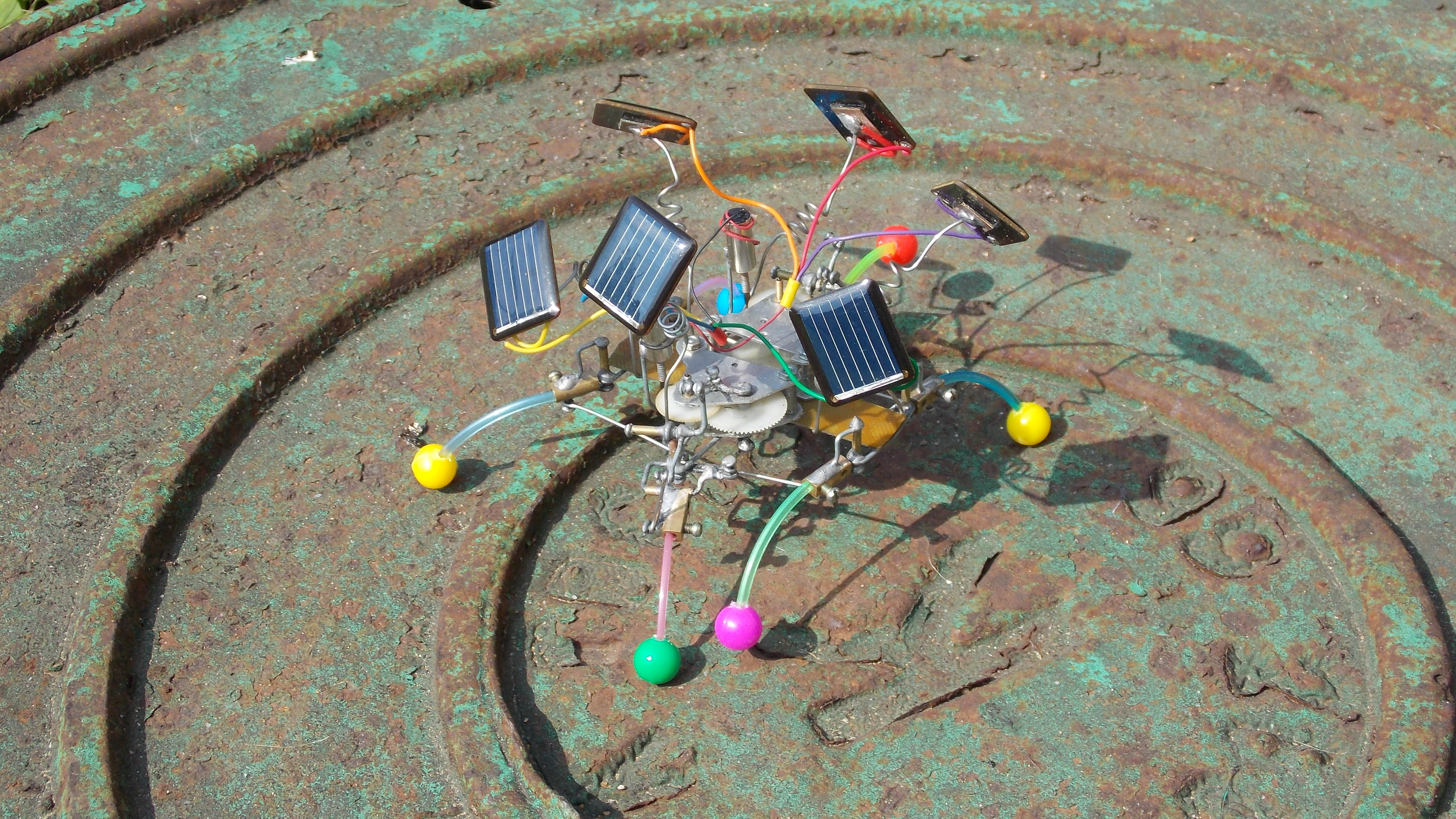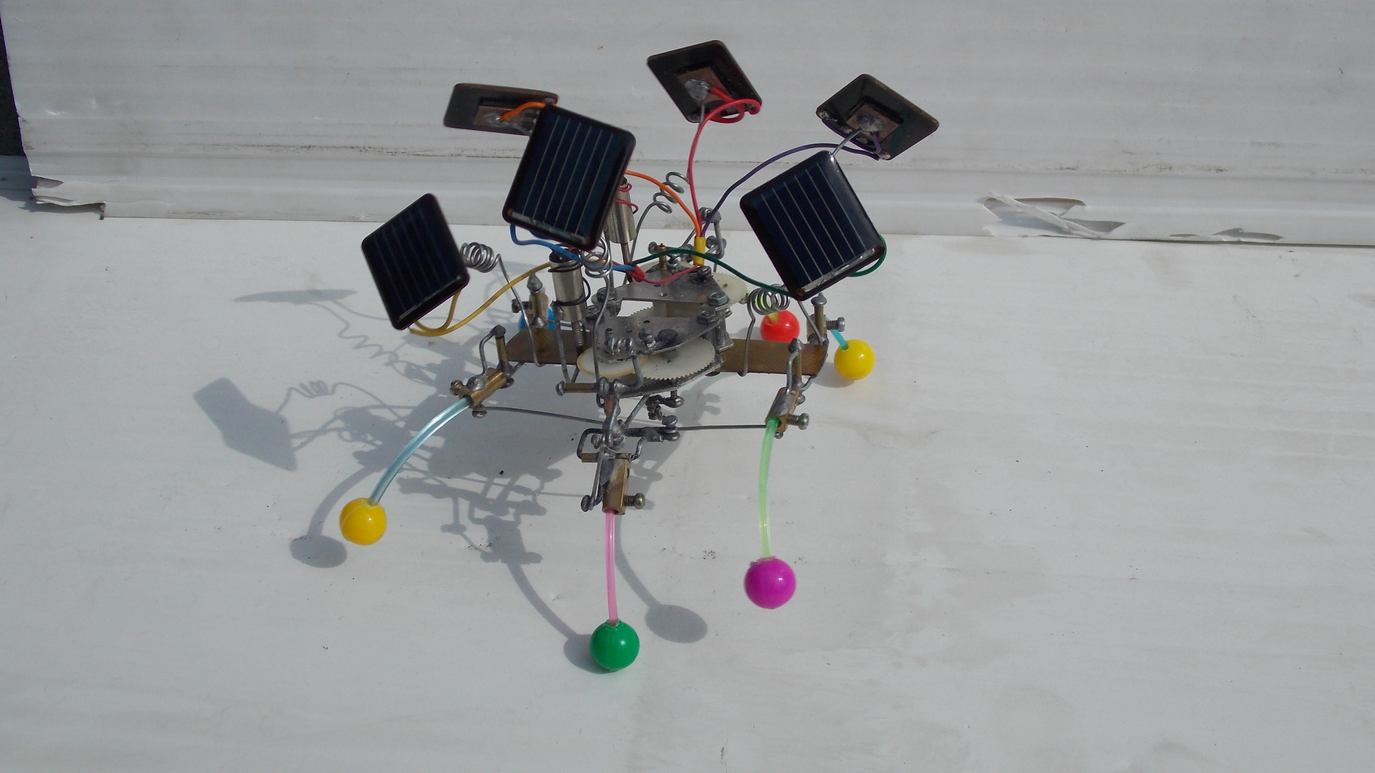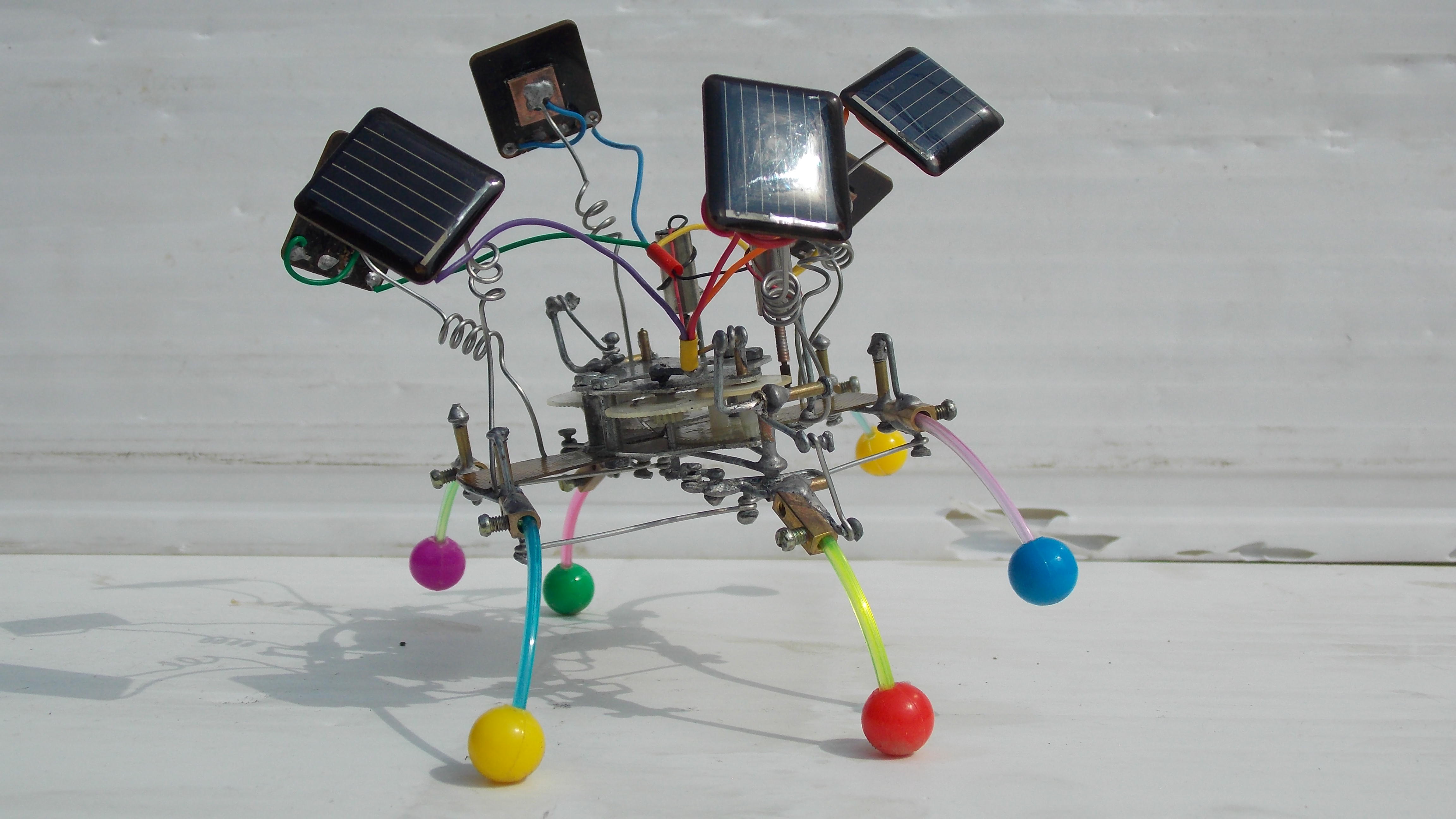 Короче, однажды аллиэкспресс подогнал мне мешок трёхвольтовых моторов, которые на деле совершенно не вертелись в схемах с солнечным питанием через транзисторы с конденсаторами. Чтоб как обычно. Но они мощно работают от обычных батареек, и ещё, как выяснилось, вполне достойно крутятся напрямую от многих панелек. Короче запитал эти моторы от пуска батареек от тех китайских тачанок (которые с ноготь размером), применил пластиковые редукторы от убогих китайских алюминиевых будильников, и воссоздал механику по образу и подобию Валентиныча. Ну вот и назовём получившуюся ходовую, на наш устоявшийся манер, "двойным валентинычем". В итоге все три ноги одной из сторон едут одновременно вперёд назад (только средняя наоборот), но средняя ещё и поднимается-опускается. Думаю, для прикола ещё упростить - до "двойного шалтая". Простопотомучтомогу. Панелек с моторами у меня с какой-то поры достаточно, могу и на фигню пустить )) Хотелось разноцветности, жизнерадостности, шариков, пружинок, цветных проводочнов.. Ну, вы понимаете - когда делаешь робота, но ни грамма не шаришь в робототехнике.