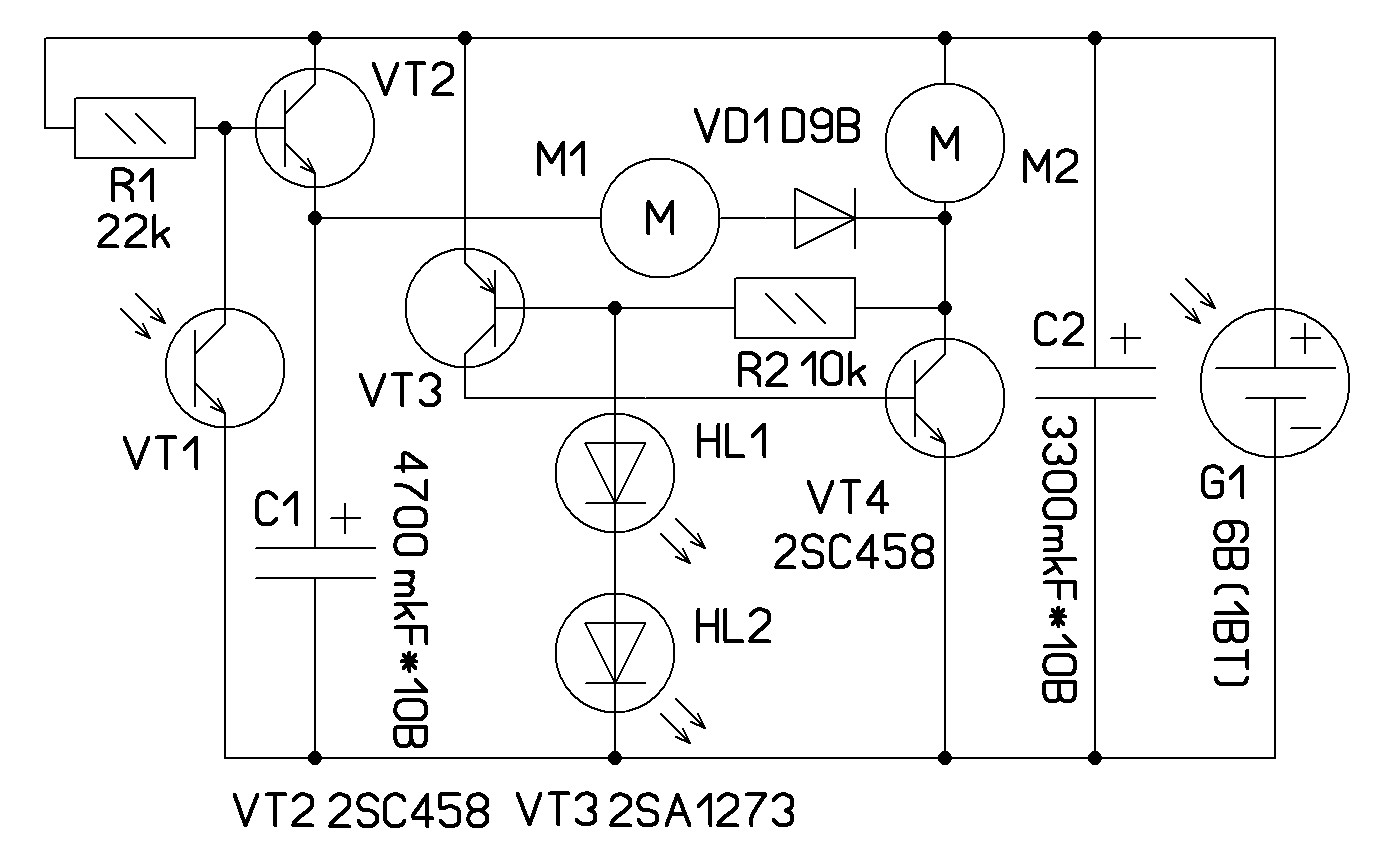 Мегабизону тчк: Ну вот примерно такая схема для реверса (экспромт,поэтому нет типономиналов на схеме). Принцип альтернативный мосту (одна батарейка - четыре ключа)вместо этого две батарейки - два ключа. Сюжет схемы (предполагаемый)такой: одна панель затемнена, другая освещена - мотор периодически вращает в одну сторону...меняем местами панели - вращает в другую... Если напутал, спецы - поправьте. Вроде все элементы "отсеметричил"... Да!, забыл: этими же панельками можно питать и второй движок.