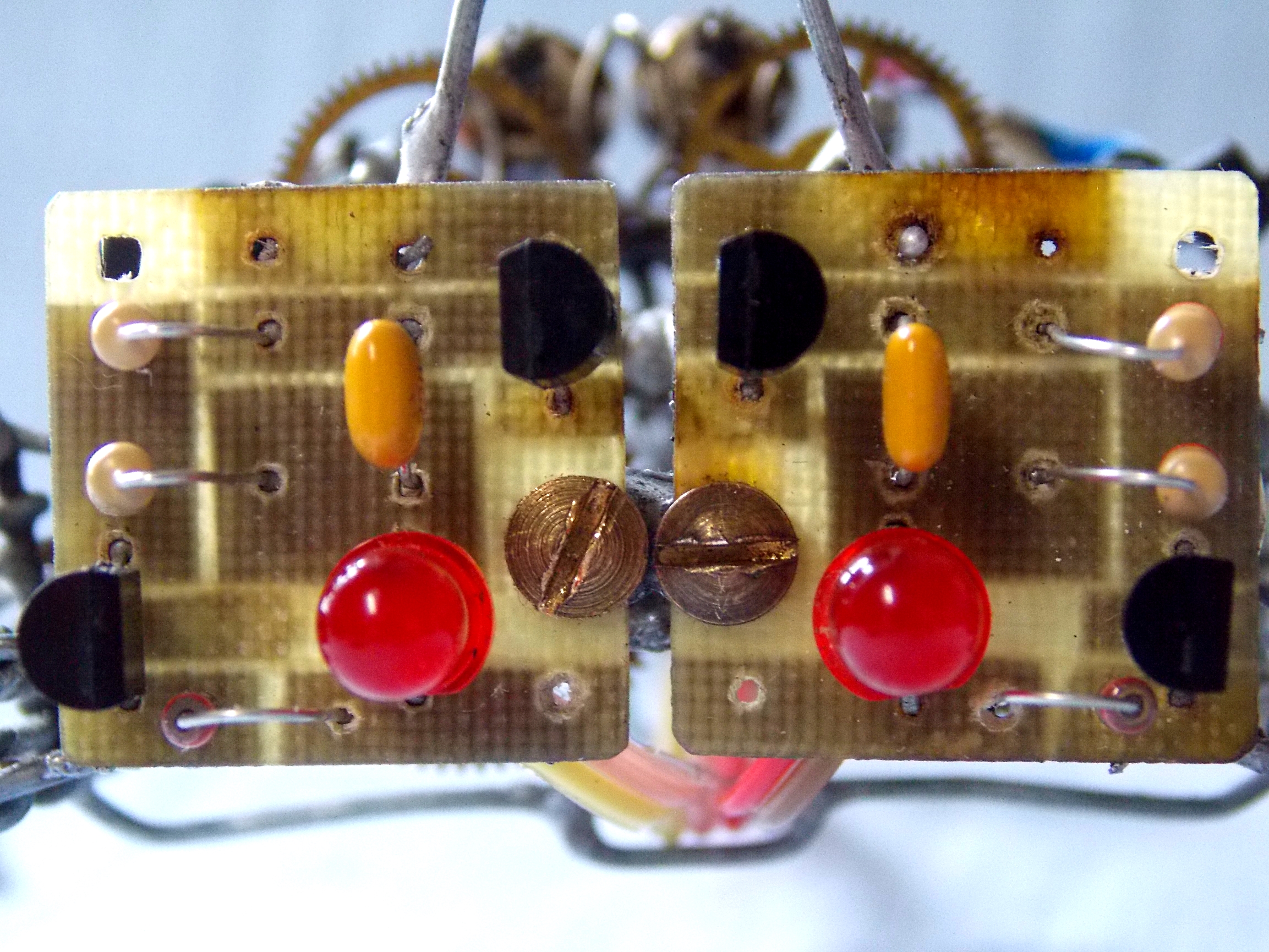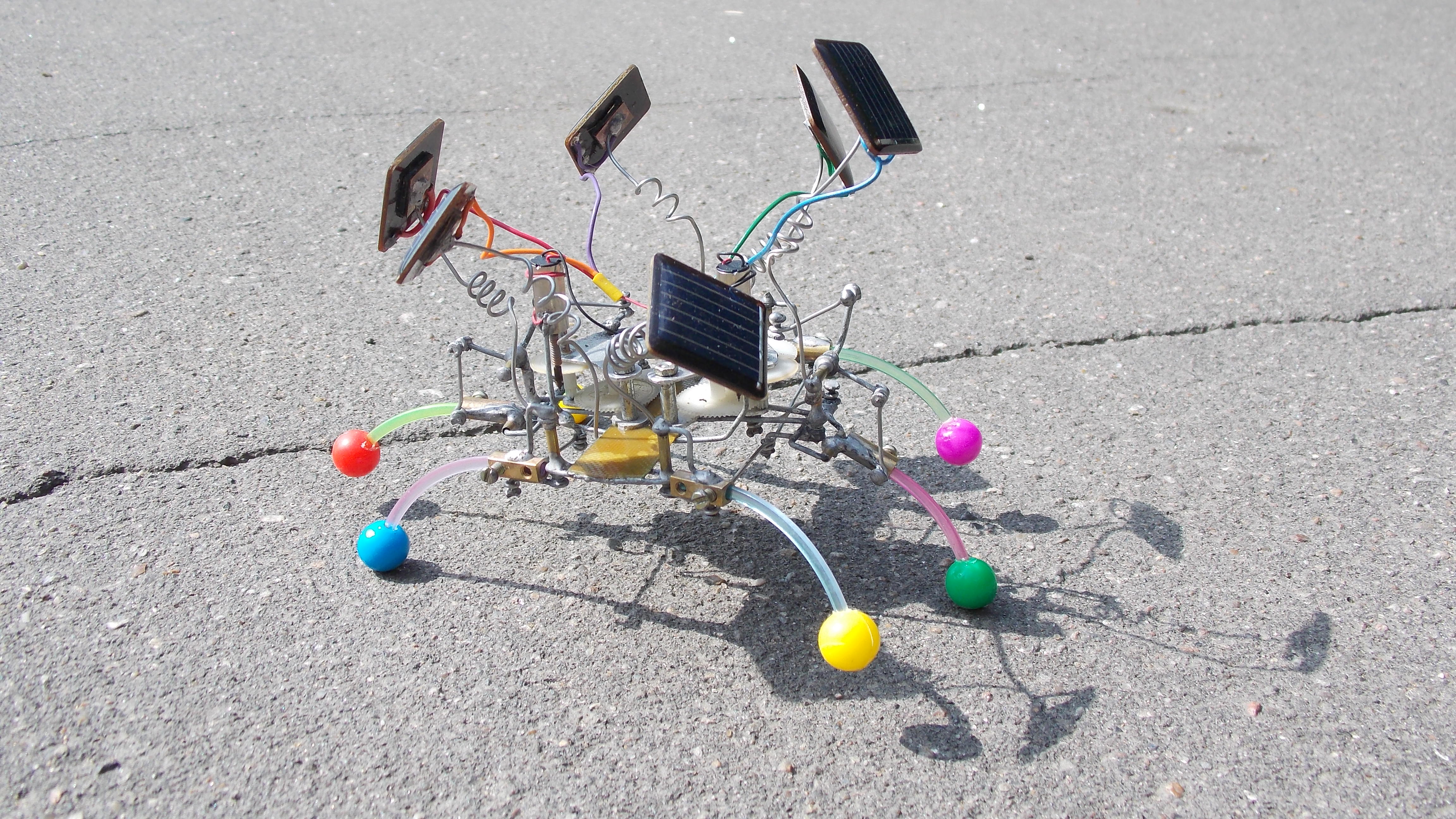 Короче, однажды аллиэкспресс подогнал мне мешок трёхвольтовых моторов, которые на деле совершенно не вертелись в схемах с солнечным питанием через транзисторы с конденсаторами. Чтоб как обычно. Но они мощно работают от обычных батареек, и ещё, как выяснилось, вполне достойно крутятся напрямую от многих панелек. Короче запитал эти моторы от пуска батареек от тех китайских тачанок (которые с ноготь размером), применил пластиковые редукторы от убогих китайских алюминиевых будильников, и воссоздал механику по образу и подобию Валентиныча. Ну вот и назовём получившуюся ходовую, на наш устоявшийся манер, "двойным валентинычем". В итоге все три ноги одной из сторон едут одновременно вперёд назад (только средняя наоборот), но средняя ещё и поднимается-опускается. Думаю, для прикола ещё упростить - до "двойного шалтая". Простопотомучтомогу. Панелек с моторами у меня с какой-то поры достаточно, могу и на фигню пустить )) Хотелось разноцветности, жизнерадостности, шариков, пружинок, цветных проводочнов.. Ну, вы понимаете - когда делаешь робота, но ни грамма не шаришь в робототехнике.