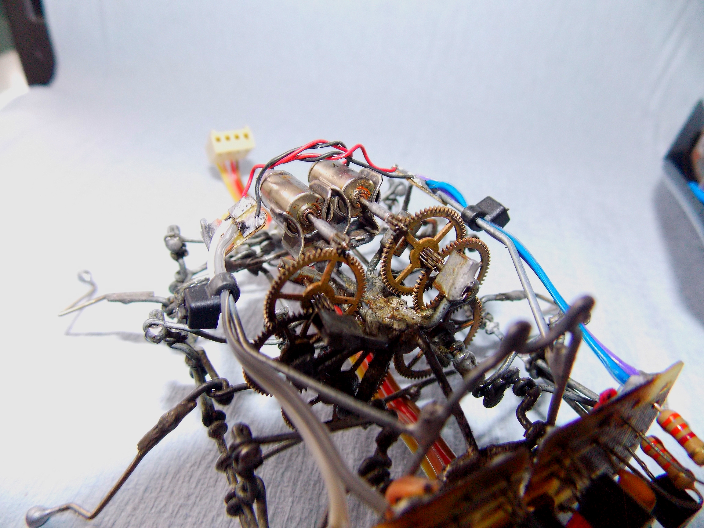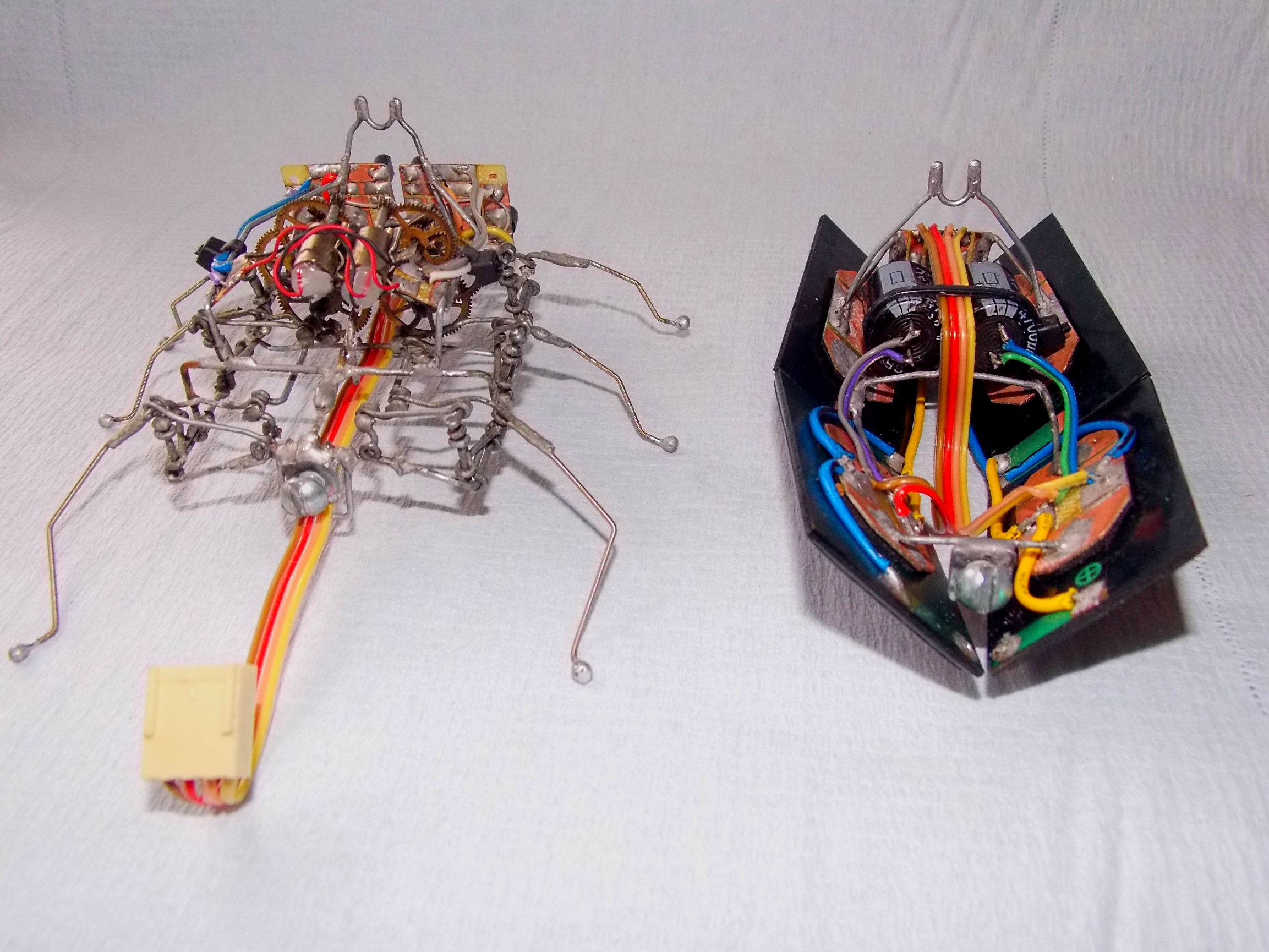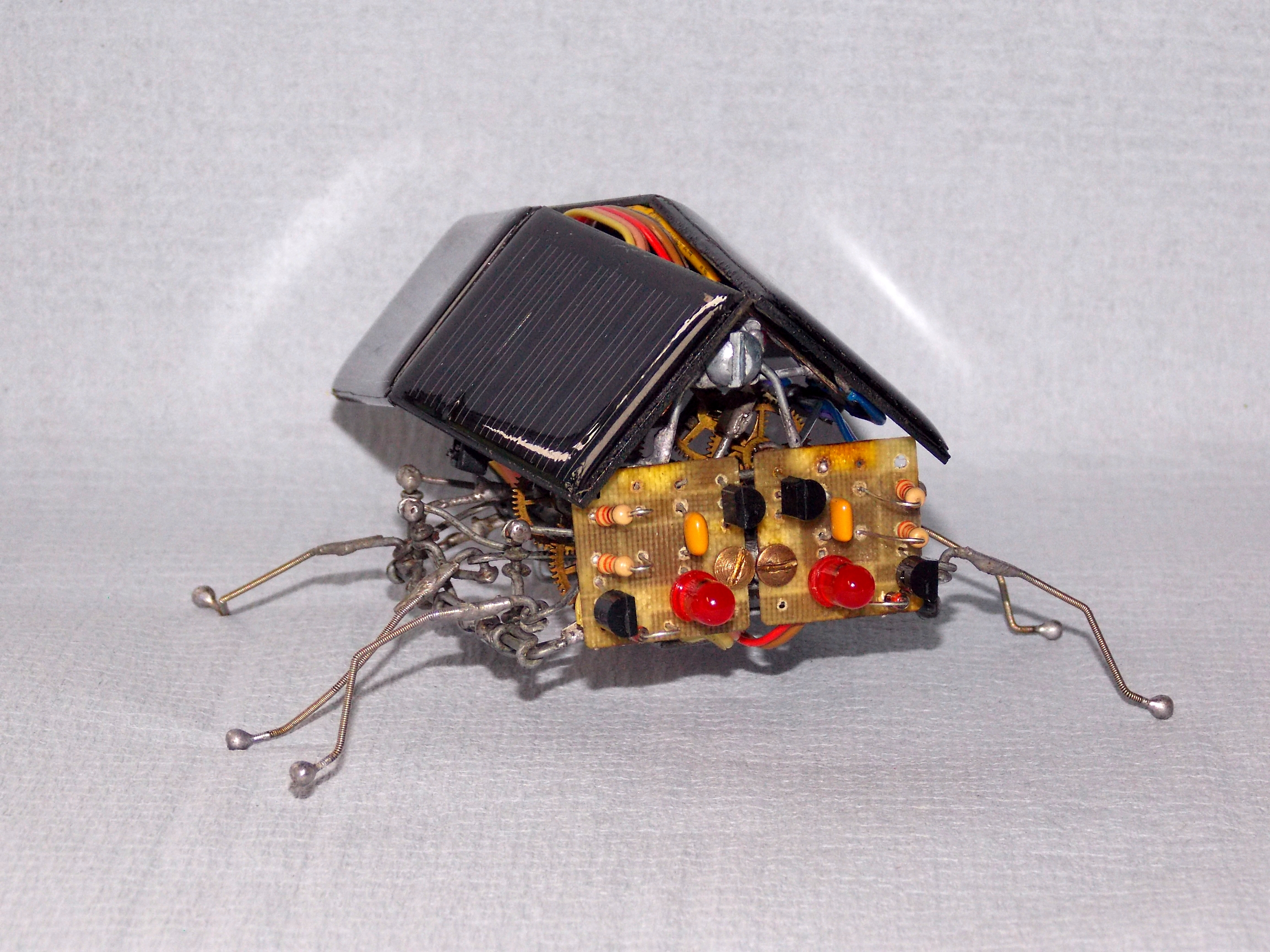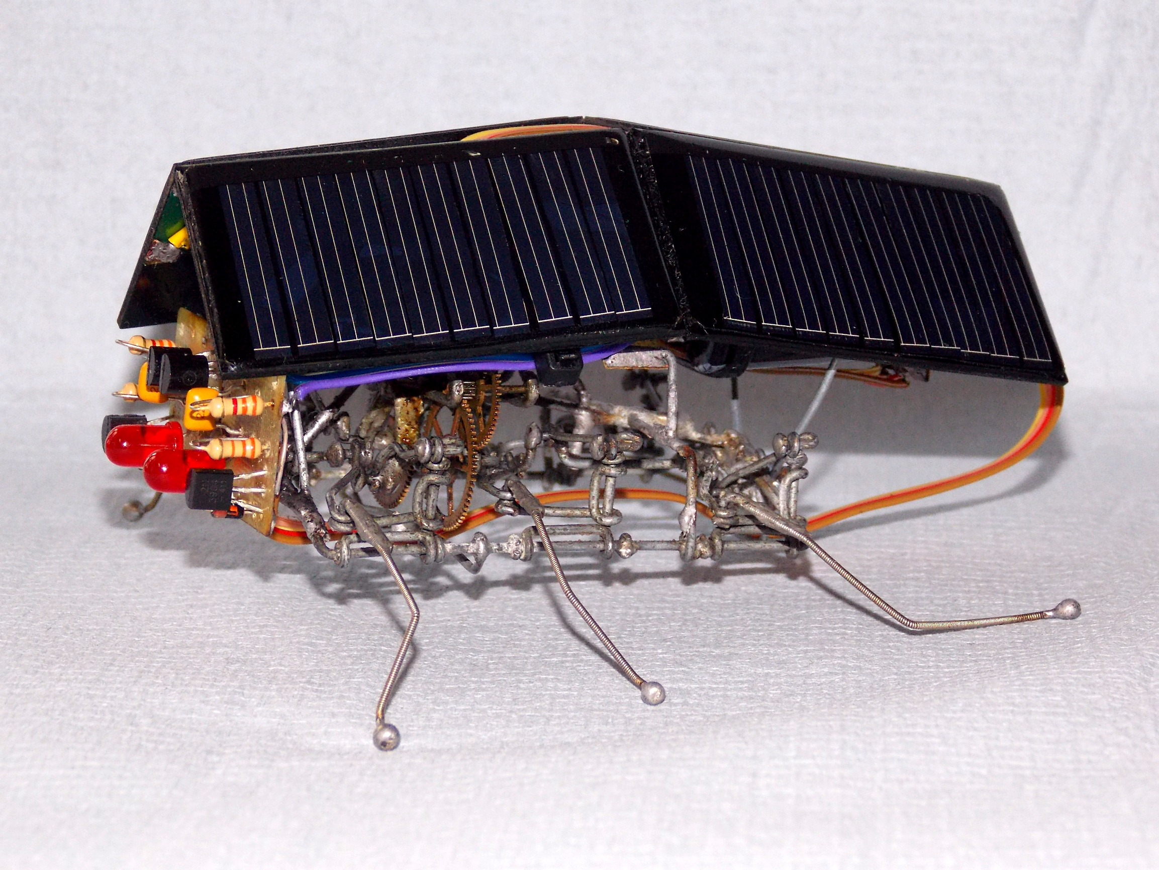 Зачем-то докопался до старенького обновлённого Странника. Как ни крути, а он всё же весьма тормозноват и скучен, даже для бима, но при этом обладает весьма симпатичной и надёжной ходовой. А посему я его "разобрал-собрал-свинтил-смонтировал". Поставил другие, настроенные на вольтаж повыше мозги (поглумился над "печатными" платами), добавил ещё панелек, придал жукообразности.. По внешнему виду естественным образом стало вырисовываться нечто похожее на созданного разумными роботами разумного робота из фильма "Страховщик" (Autómata), что само по себе довольно неплохо. От туда и новое имечко: