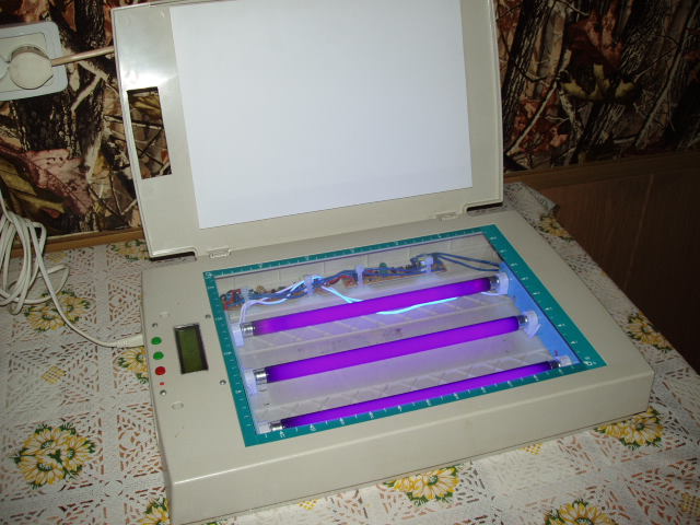 Автору респект! Использовтаь корпус из-под сканера прикольно, крышка корпуса обспечивает очень плотное прижатие шаблона к пп, из такой конструкции можно доработать и для двухстороннего экспонирования пп Кстате я уже воплотил по образу и подобию, правда LCD индикатор еще не поставил