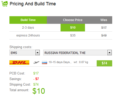 Хочу поделится проверенным сервисом по изготовлению печатных плат в Китае(3pcb.com). Качество и цена на высоком уровне. 10 Плат 100х100мм стоят всево 10$. Быстрая доставка. Всем советую.