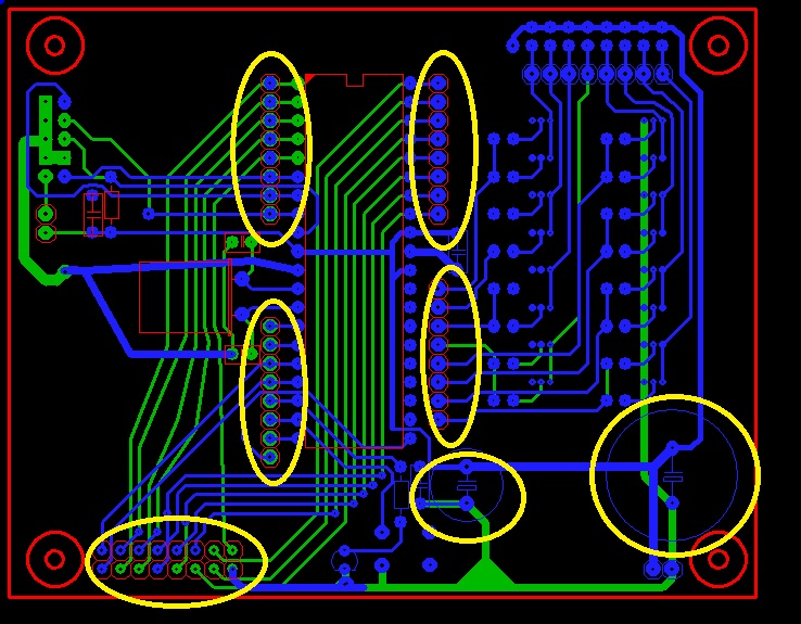 Кстати, про удобство запайки разъемов, панелек под микрухи и т.д. Прежде чем запаивать, делаем отверстие чуть больше, спаиваем два слоя, тонким проводком, а затем, припаиваем например тот же разъем, к одному удобному слою!