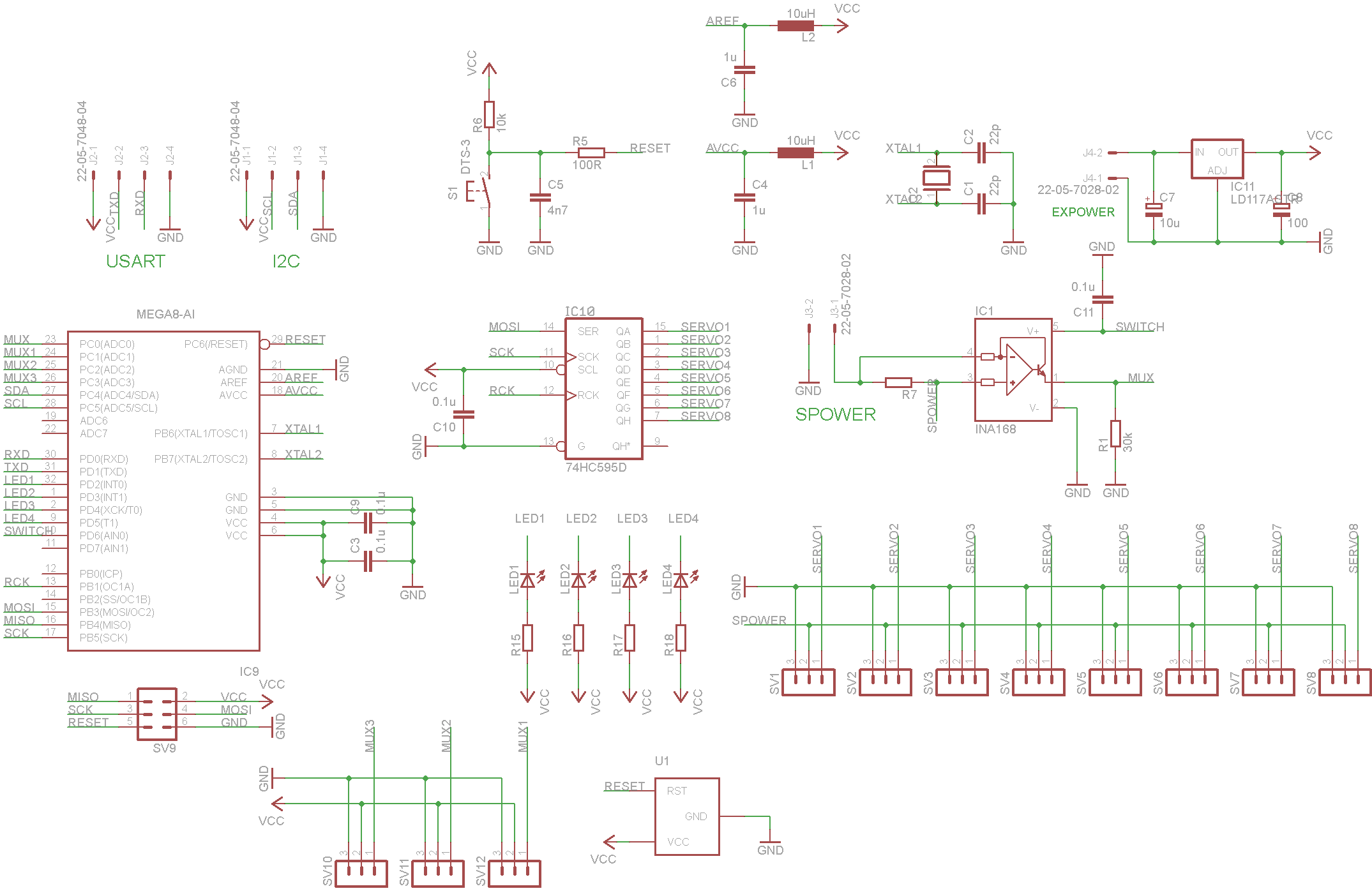 -= Александр =- писал(а):Питание и землю для серв надо завести тоже отдельными толстыми дорожками прямо от разъема питания. Чтобы токи серв не текли через цепи других компонентов.