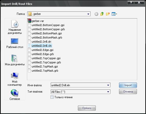 Да, забыл сказать, смотрю в ViewMate 10.2, слои я смотрю через "Import Gerber", а Drill там чегото не найти, точнее есть но формат другой
