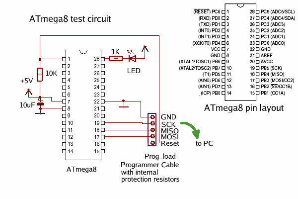 Пару недель назаж попытался воплотить в железе первые схемы. Подумав что достаточно уже знаю начал со своего мини-проекта - электронного термометра. Схему собрать я собрал, а вот с прошивкой возник затык - неожиданно оказалось, что я не знаю как залить её из BASCOM через FT232RL (такой вот конфух). Спалив кучку 3х вольтовых светодиодом в ходе попыток прошивки (проверял ими схему за неимением на тот момент вольтметра), а возможно и не только их. Тогда я разобрал схему и собрал самую простую которая мне встречалась (в ISIS сделал максимально похожую на реальную схему чипа, так проще разбираться в контактах при сборке схемы):