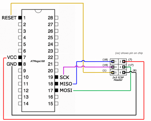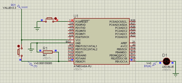 Пару недель назаж попытался воплотить в железе первые схемы. Подумав что достаточно уже знаю начал со своего мини-проекта - электронного термометра. Схему собрать я собрал, а вот с прошивкой возник затык - неожиданно оказалось, что я не знаю как залить её из BASCOM через FT232RL (такой вот конфух). Спалив кучку 3х вольтовых светодиодом в ходе попыток прошивки (проверял ими схему за неимением на тот момент вольтметра), а возможно и не только их. Тогда я разобрал схему и собрал самую простую которая мне встречалась (в ISIS сделал максимально похожую на реальную схему чипа, так проще разбираться в контактах при сборке схемы):