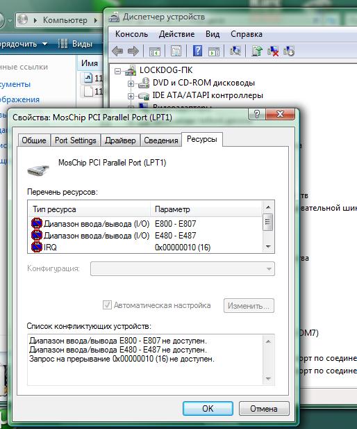 В общем купил себе PCI карту с LPT портом, на метеринки у меня есть такая функция, что если карта инсталирована неправильно, то там загорается красный светодиод, так вот он и загорелся, хоть как я и не старался правильно установить её, ладно, далее я включил компьютер и дрова нормально на эту карточку установились, но вот далее в чём проблема, когда я просматриваю ресурсы LPT порта, то они не доступны:
