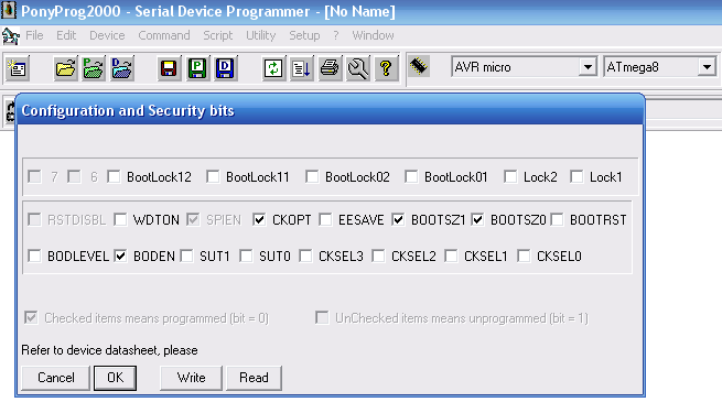 Собрал вчера USB - Программатор STK500v2 by Petka. PCB тоже от Петки - миниатюрность понравилась.. Спаял, проверил - перепроверил - всё ок. Поставил дрова для 232-ой, Всё увиделось. Запрогал фьюзы, запустил самопрограммирование - пошло литься. ..Минут через 40 "Всё ок." Переключил в норм. режим, попытался прочитать что-нибудь из Меги8 (У Меня отдельно на макетке Мега8 со всеми обвязками и пр.) - пишет ошибку - "Device missing or unknown device"!