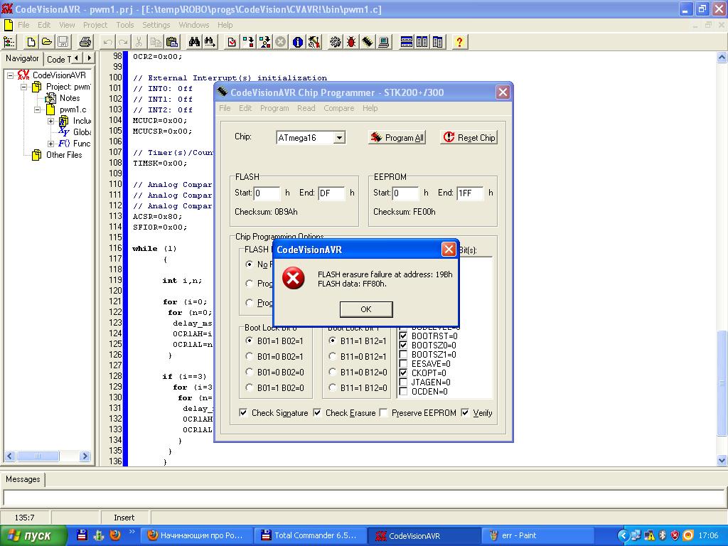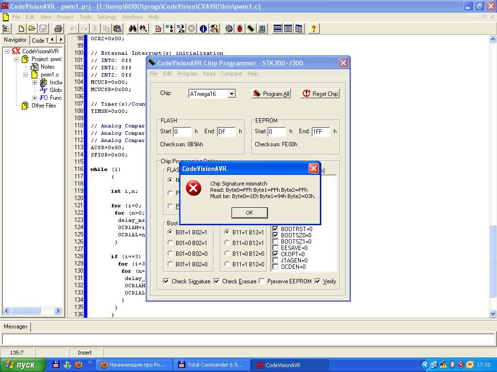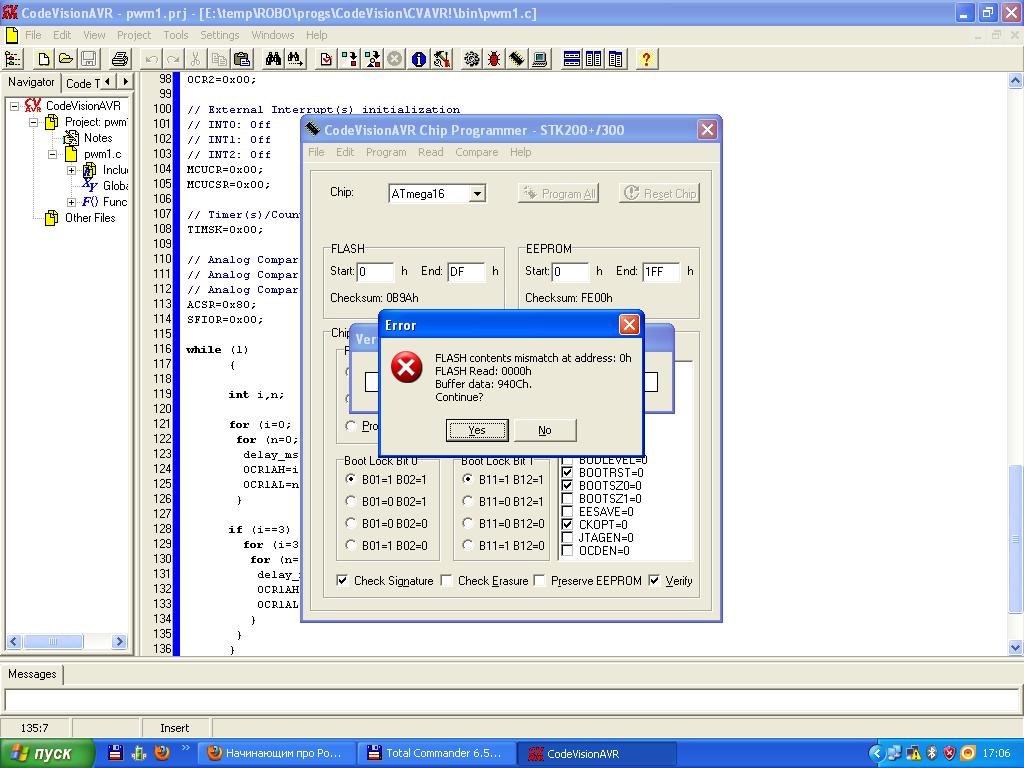 Решил я вспомнить как программировать микроконтроллеры, перепаял немного свою тестовую платку а именно, перепаял выводы питания на новое место, добавил светодиод, полевик, и впаял дополнительную плату для 20пиновых МК, после пробежался тестером по контакам навсякий случай, замыканий нет! Решил прошить старую мегу 16, все подсоединил, навсякий проверил питание - все в порядке, в коджвижен жму программировать и мне выдает ошибку №1, ну думаю нада еше попробовать (ибо когда я давно шил этуже мегу она мне иногда выдавала ошибку но прошивал я ее с такой ошибкой раз 20), снова пробую зашить прогу и выдает ошибку №2, забеспокоился скачал понипрог попробовал чтение памяти из него - пишет ошибку (-24), ну решил последний раз попробовать кодвиженом и мне выдало ошибку №3...программатор вроде работает лампочки горят....я совсем запутался кто нибудь вообше понимает какой смысл несут эти ошибки и в чем может быть проблема ?