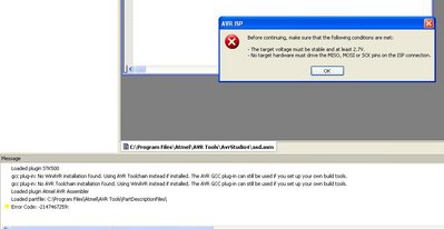 Loaded plugin STK500 gcc plug-in: No AVR Toolchain installation found. Using WinAVR instead if installed. The AVR GCC plug-in can still be used if you set up your own build tools. Loaded plugin Atmel AVR Assembler Loaded partfile: C:\Program Files\Atmel\AVR Tools\PartDescriptionFiles\ Error Code: -2147467259: