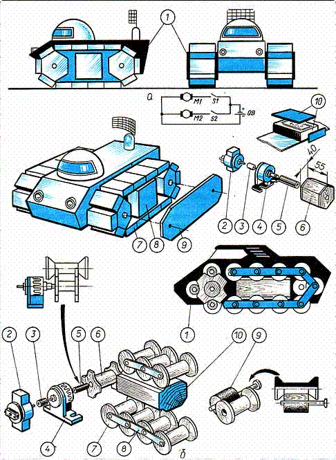 Гусеницы другой модели (рис. б) собираются из одинаковых по размеру катушек от ниток. Они соединяются осями с помощью пластин-звеньев, вырезанных из миллиметрового картона или выпиленных из фанеры, полистирола. Оси — полистироловые вязальные спицы или литниковые стержни от сборных моделей самолетов, танков, кораблей.
