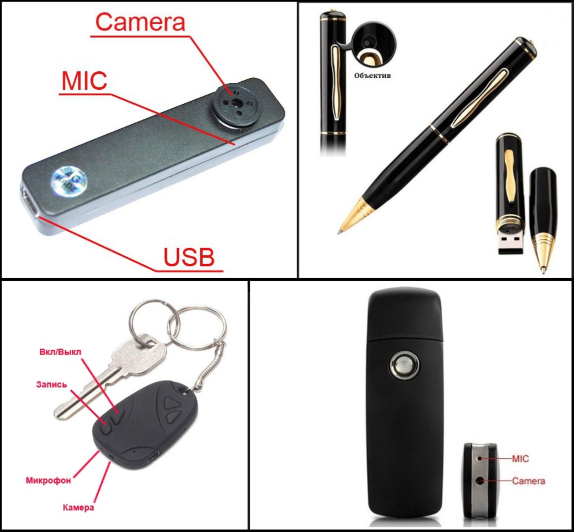 беспроводная камера или "видеорегистратор" в пишущей ручке (хоть муляж, хоть действительно пишущая), в игрушках, в "пуговицах" одежды, в брелкоках,... pin-hole камеры, микрокамеры, камеры работающие при низком освещении, работающие от д/у пульта и т.д. наручные часы-смартфон попадает? с одной стороны нет. а с другой легко - будет в них хотя бы камера и всё, дальше будет решать хексперд, отнести это к средству негласного съёма информации или нет. в общем скорей всего как минимум всё, где наличие камеры не очевидно или незаметно. кстати у себя дома или ещё где, опять таки у себя, просто так где захочется нельзя камеры раставить (себя снимай хоть до посинения, видимыми или скрытыми как и где угодно камерами, а других нельзя. объявление при входе в квартиру вешать?). электронные эндоскопы туда же и фиолетово, что кто-то его взял без злого умысла для проверки труб или осмотра каких других труднодоступных мест. некоторые смарт/vr очки тоже могут подпадать. ещё могут подпадать радионяни (покупные или самодельные хоть по схемам из журнала радиво), смарт и прочие часики и ряд других вещей для родителей, переживающих за своих детей. допустим есть в устройстве функционал "обратный звонок" (отправляется запрос, а устройство перезванивает. это кстати ещё и нарушение прав того, кто такие часики носит, вне зависимости от возраста) или отправка уведомления (маленький ребёнок снял часики с ручки и приплыли), всё, это уже не радионяня и не часики, помогающие пообщаться с ребёнком, который ещё не может телефоном пользоваться, а злобное спецсредство за которое штраф или отсидка. есть какая-то общая муть по поводу лицензий на приобретение и использование, но... эта муть вроде относится только к "оперативно-разыскной деятельности".