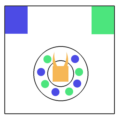пусть робот сначала, вращаясь, разбивает кучку шариков (см. картинку ниже - чтобы шарики все вылетели за внешний круг), а затем собирает их простым манипулятором в области соотв. цветов.