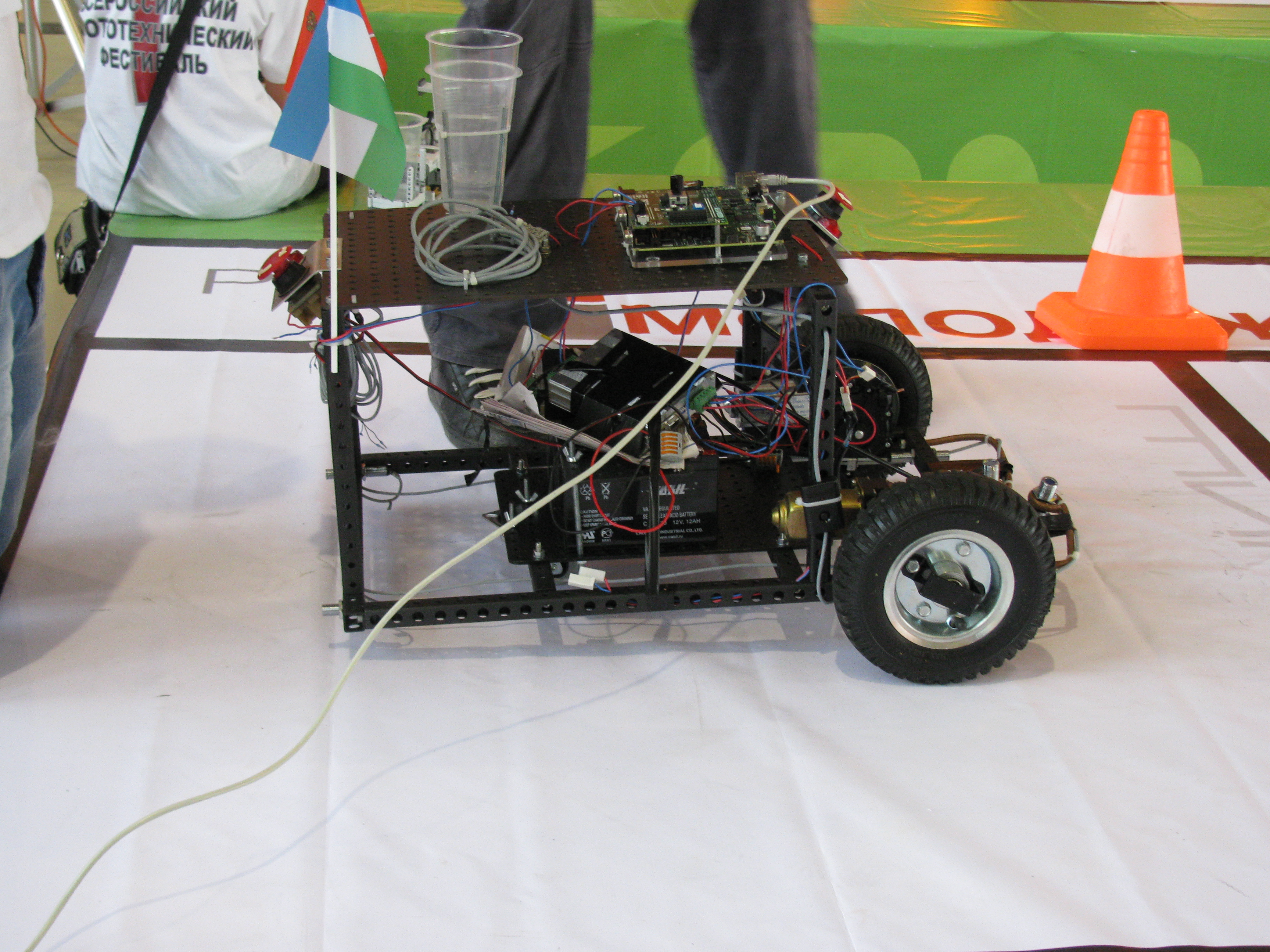 Оборудование базового набора за 100 т.р. поступило с задержкой, практически в последний момент и не было между собой состыковано. Часть горела на ходу, часть вообще не устанавливалась физически (например, энкодеры). Почти вся электроника от NI, софт - Labview от них же, железки выпилены в России. Комплект можно было бы продавать раза в 3 дешевле и не остаться в накладе. Задание состязаний было проехать по прямой туда и обратно семь метров. Справились немногие.