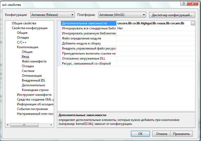 - В открытом проекте выберите: Project->Properties (Проект->Свойства). - Далее Configuration Properties->Linker->Input - И добавляйте имена библиотек в поле "Additional Dependencies" (Дополнительные зависимости): cxcore.lib cv.lib highgui.lib cvaux.lib cvcam.lib