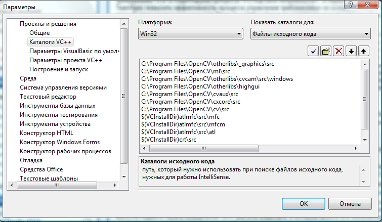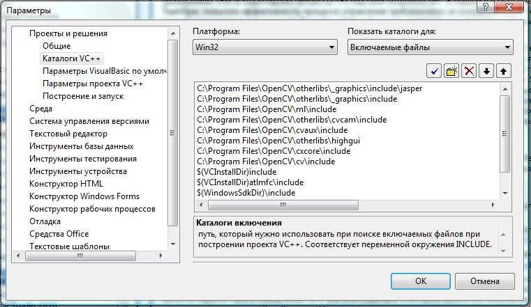 и добавляйте следующие строки: "C:\Program Files\OpenCV\cv\include" "C:\Program Files\OpenCV\cxcore\include" "C:\Program Files\OpenCV\otherlibs\highgui" "C:\Program Files\OpenCV\cvaux\include" "C:\Program Files\OpenCV\otherlibs\cvcam\include" "C:\Program Files\OpenCV\ml\include" "C:\Program Files\OpenCV\otherlibs\_graphics\include" "C:\Program Files\OpenCV\otherlibs\_graphics\include\jasper" Результат можете увидеть на скриншоте.