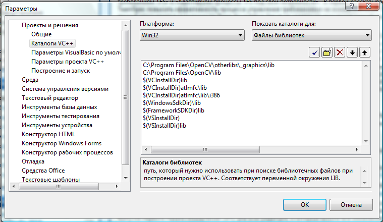 - Далее выберите в листбоксе "Library files" ("Файлы библиотек") и добавьте следующие строки: "C:\Program Files\OpenCV\lib" "C:\Program Files\OpenCV\otherlibs\_graphics\lib"