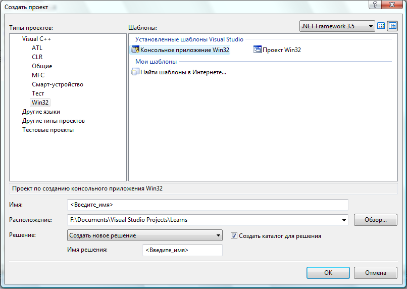 - В MSVS выберите File->Create->Project (Файл->Создать->Проект) и создайте консольное приложение в VC++