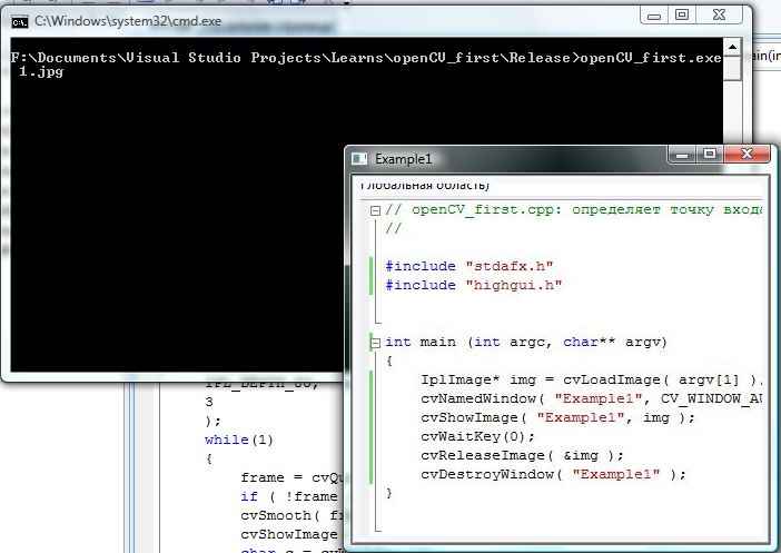 Эта строка непосредственно загружает изображение. Функция cvLoadImage() сама выделяет нужный объём памяти для изображения и может работать с большим числом форматов, включая: BMP, DIB, JPEG, JPE, PNG, PBM, PGM, PPM, SR, RAS, и TIFF. В результате она возвращает указатель на структуру данных изображения. Эта структура называется IplImage. Мы используем указатель cvLoadImage() для работы с изображение и его данными.