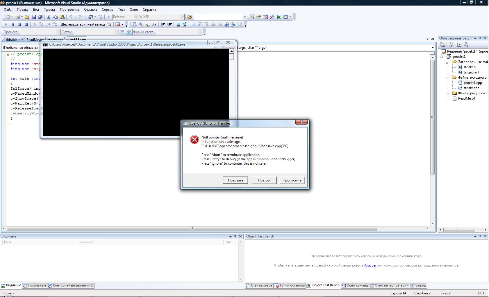 приложение запускается с любой из двух камер, однако ничего не происходит т.е. таже фигня что и при попытки вывести в окно видеофайл. консоль вроде запускает бинарник но ничего не происходит.