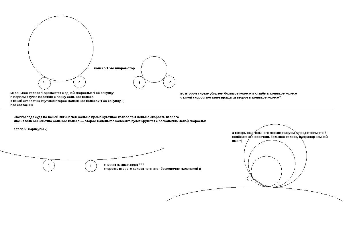 demon333 писал(а):Прикольные рассужденияОткройте термех или детали машин.Угловая скорость точки на ободе колеса зависит от диаметра колеса и числа оборотов.Линейная скорость оси колеса вдоль плоскости также зависит от радиуса и от числа оборотов.А передаточное отношение получается либо при делении числа зубъев ведомого и ведущего,либо при делении делительных диаметров ведущего и ведомого колес.Т.е. передаточное число между колесом и мотором будет определяться как:диаметр колеса поделить на диаметр вала вибромотора.Чем больше передаточное число тем выше момент,но ниже скорость вращения.Нужен компромисс,для высокой скорости маленькое колесо,но есть шанс не тронуться с места,либо увеличивать диаметр колеса и терять в скорости(при условии кончено что число оборотов вибры всегда постоянное)