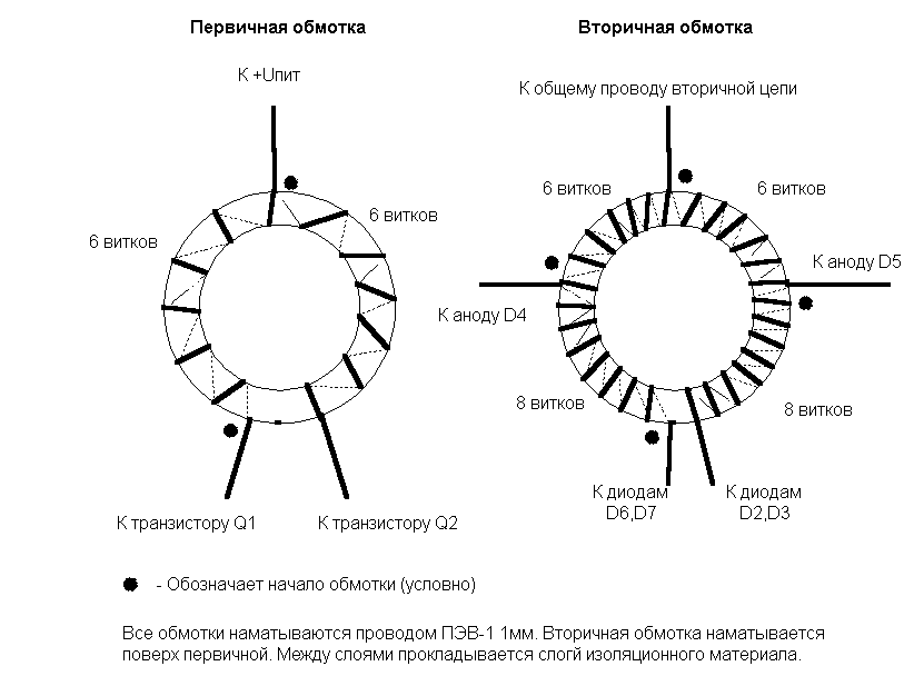 Трансформатор Т1 мотается на сердечнике площадью 0.6кв.см следующим образом
