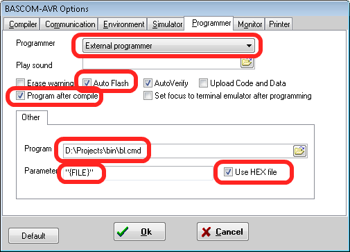 Для прошивки робота бутлоадером из BASCOM-а настраивается "внешний программатор"