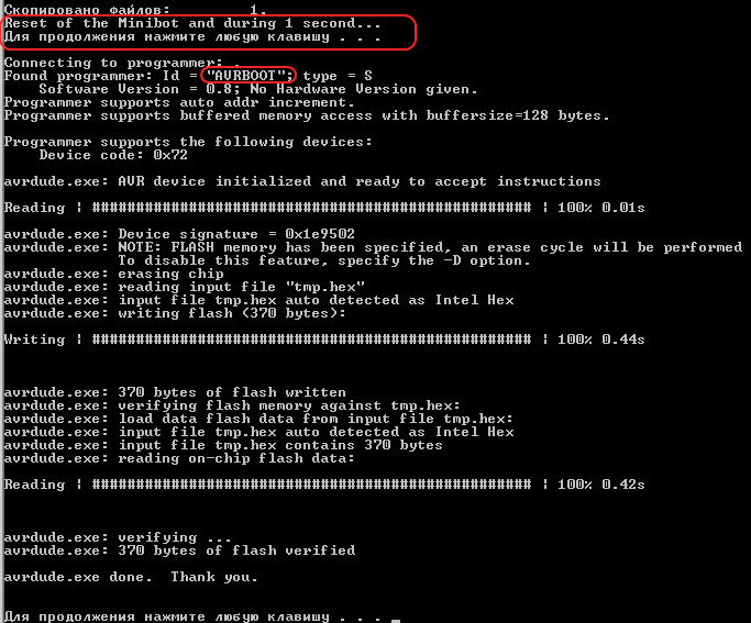 затем исполнение останавливается: нужно нажать на роботе Reset - запустится бутлоадер, который 1 секунду будет ожидать символ S из UART-а, чтобы начать программирования, в ином случае просто запускается существующая программа. Вот в течение этой секунды и нужно нажать на любую клавишу, чтобы выполнились следующие команды: