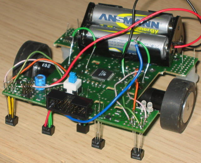 Продолжение: добавлены разъемы (еще не все) и подключены датчики линии. Простейшая ("рефлекторная") программа и 10 минут дизайна и лайн-трейсер готов :P