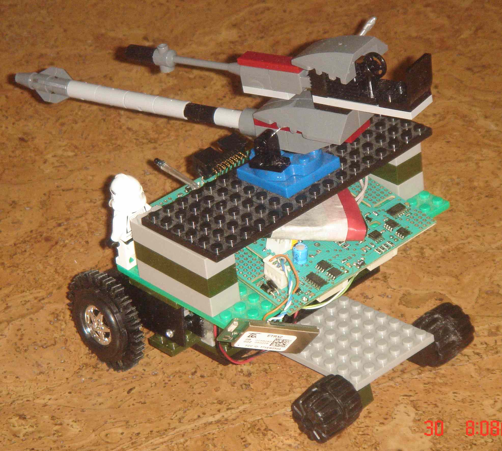 Прототип из картона и колесиков прокрутки от мышки вместе с родными энкодерами. Движки от приводов головок cd-rom-ов - оказались разными по характеристиками. Через ZigBee модуль подключен к PC и управляется серез терминал по программе переделанной из RC5-управления EdGull'a. Квадратный разъем USB добавлен в качестве гнезда для зарядки - через USB кабель.