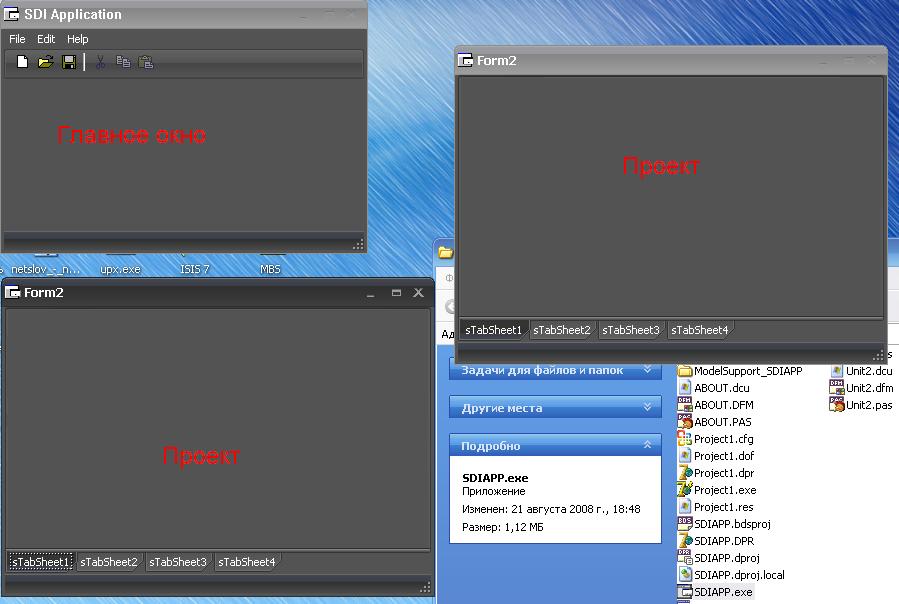 Несколько окошек, неограниченных главной формой. Типичный пример: так сделаны делфи 7 и фотошоп(старые версии, если не ошибаюсь). Плюсами: каждое окошко самостоятельно и нет заморочек с МДИ (например, не сливается меню дочки и матери). В остальном: почти тот же мди, тока глюков поменьше. Т.е. принцип один программатор, один терминал, много проектов открытых.