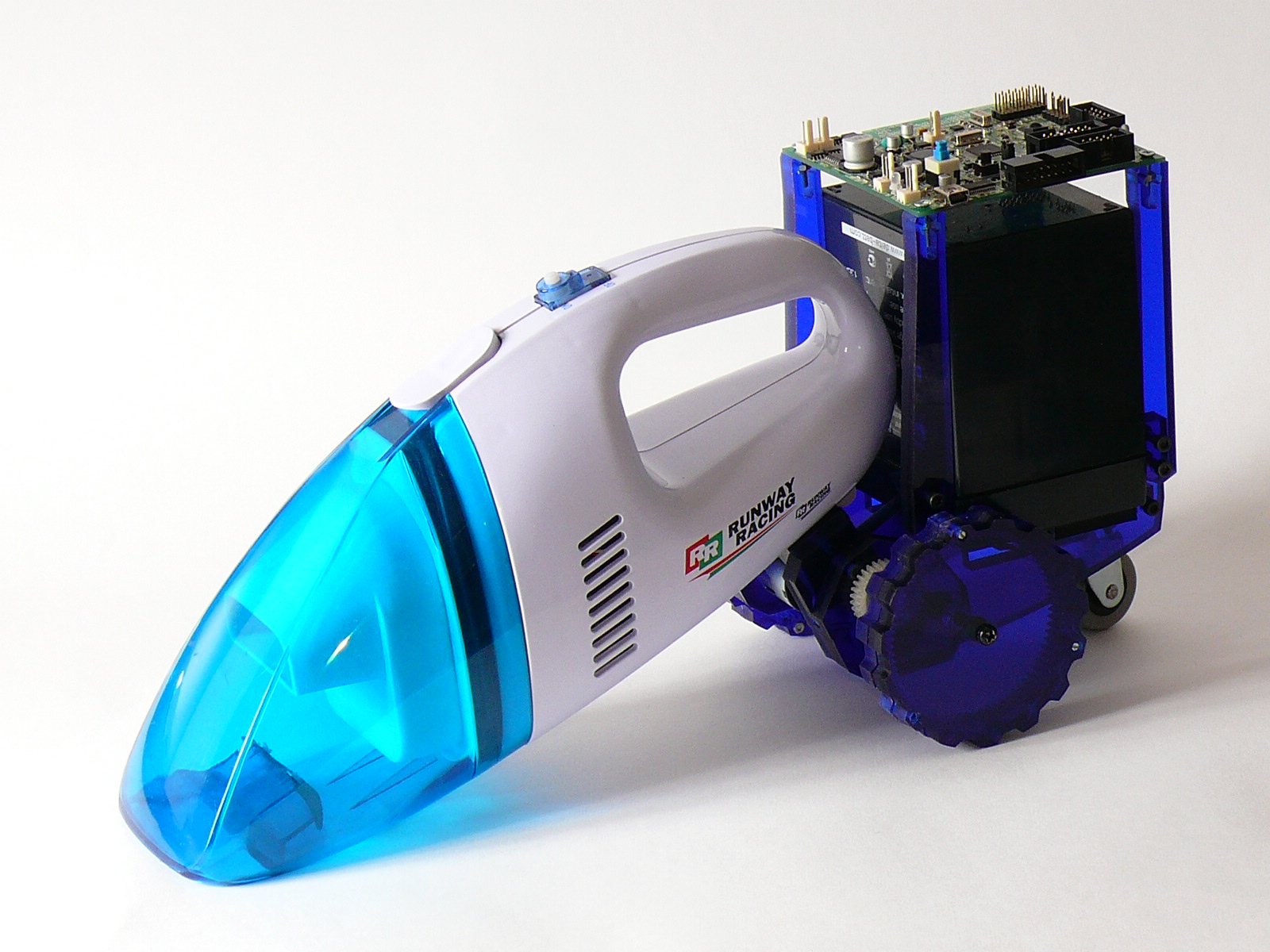 А м.б. нужно ведущие колеса расположить по бокам от пылесоса наподобие колесного парохода вынеся их вперед? Подруливающее колесо - прямо под хвост пылесосу. Аккумуляторы и электронику - тоже по бокам около ведкщих колес расположить?