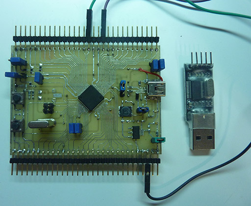 Flash loader demonstrator. на плате boot0 подтягивается к +, boot1 к земле (очень логично ставить перемычки). перегрузили ресетом или питание передёрнули, всё, встроеный бутлоадер запущен. запустили флеш лоадер, настроили ком-порт, в сл. окне можно затирать, считывать или прошивать.