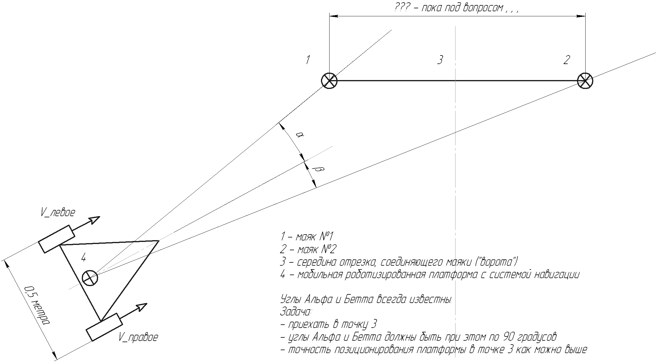 Есть мобильный робот, который всегда знает (высчитывает на МК ) углы между направлением движения робота и направлениями на эти два маяка.