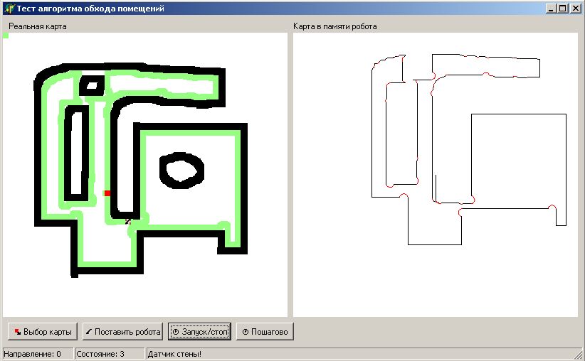 на реальной карте: зеленым обозначаются пропылесосенные участки красное - маяк, выставляемый роботом при первом касании стены черное - стены ну и изображение робота - что-то непонятное с коричневыми углами :)