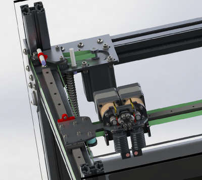 После нескольких итераций конструкция оформилась в H-bot на профильных направляющих со столом на 4х ШВП. В конструкции всего две детали требующие простой фрезеровки (в домашних условиях можно заменить хим.фрезеровкой), несколько несиловых деталей под 3д печать и довольно много резьбовых отверстий. Конструктив - станочный профиль и кроеный 4мм алюминий. Проектирование механических компонентов "до последнего винтика" заняло, в пересчете на полный день, примерно 1.5мес.