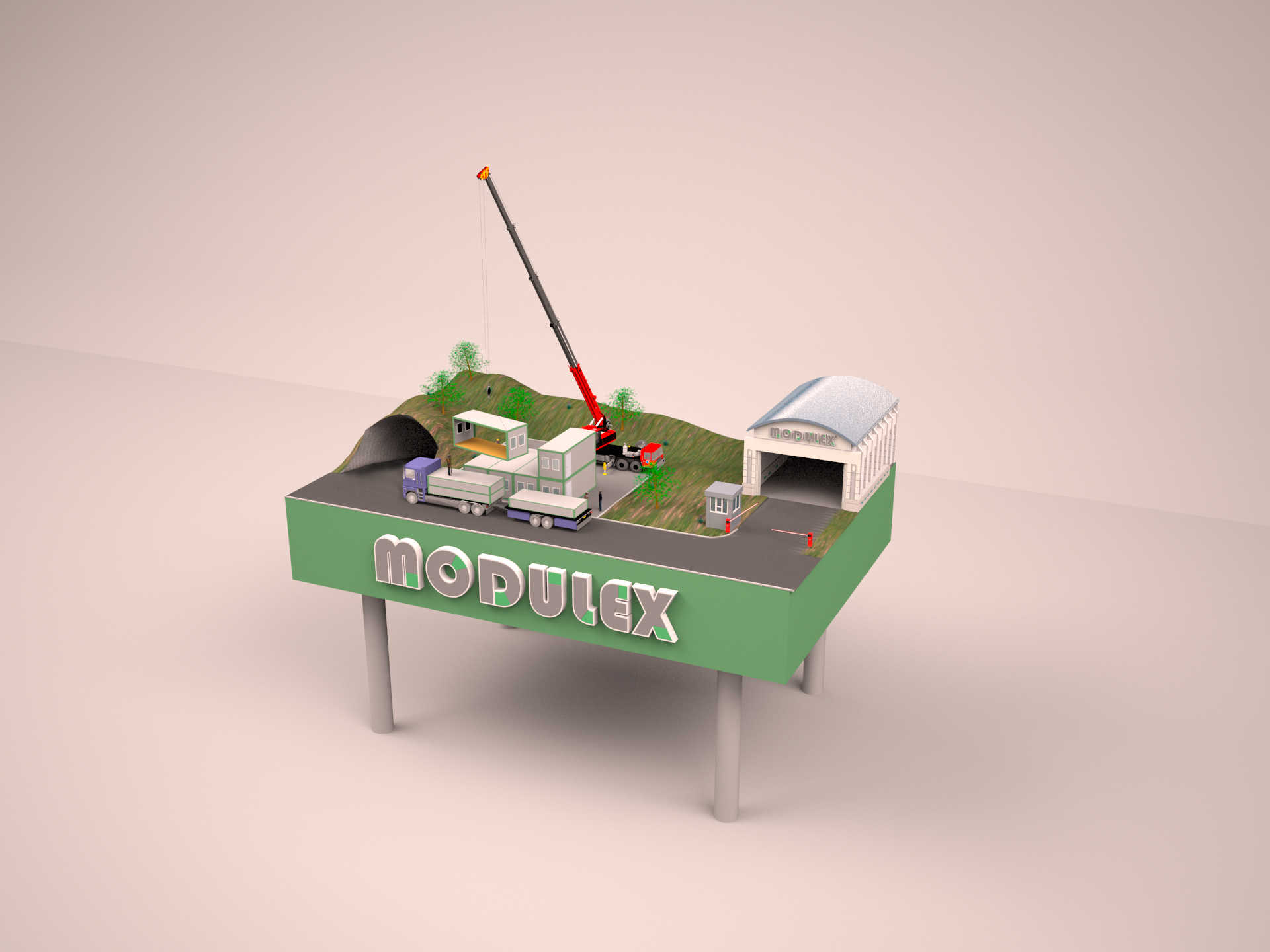 1. Открывается ангар из которого выезжает грузовой автомобиль с погруженными на него 8ю модулями. Автомобиль с прицепом как на визуализации.