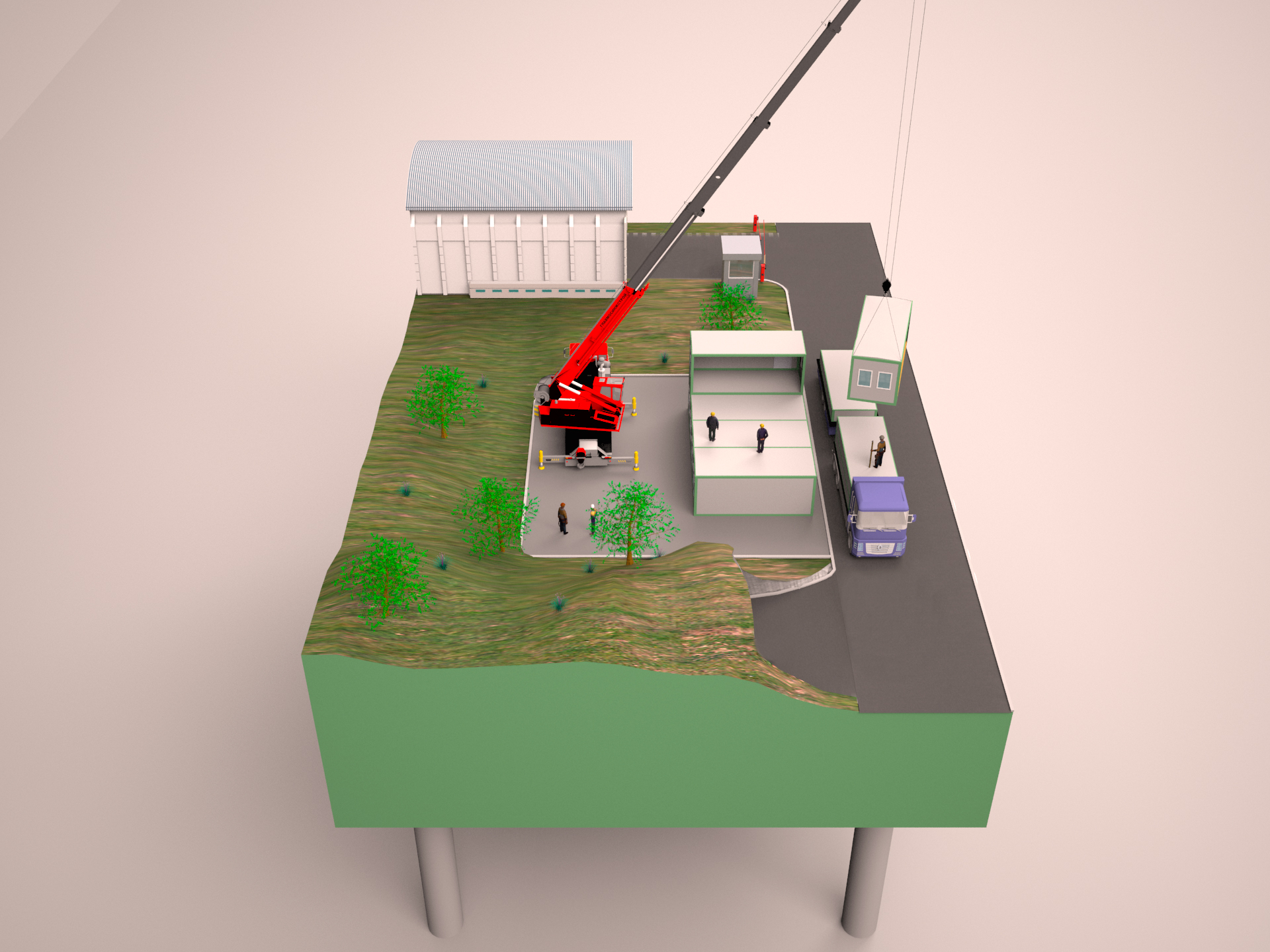 7. Автомобиль останавливается возле площадки строительства. Кран в обратном порядке грузит все модули на автомобиль.
