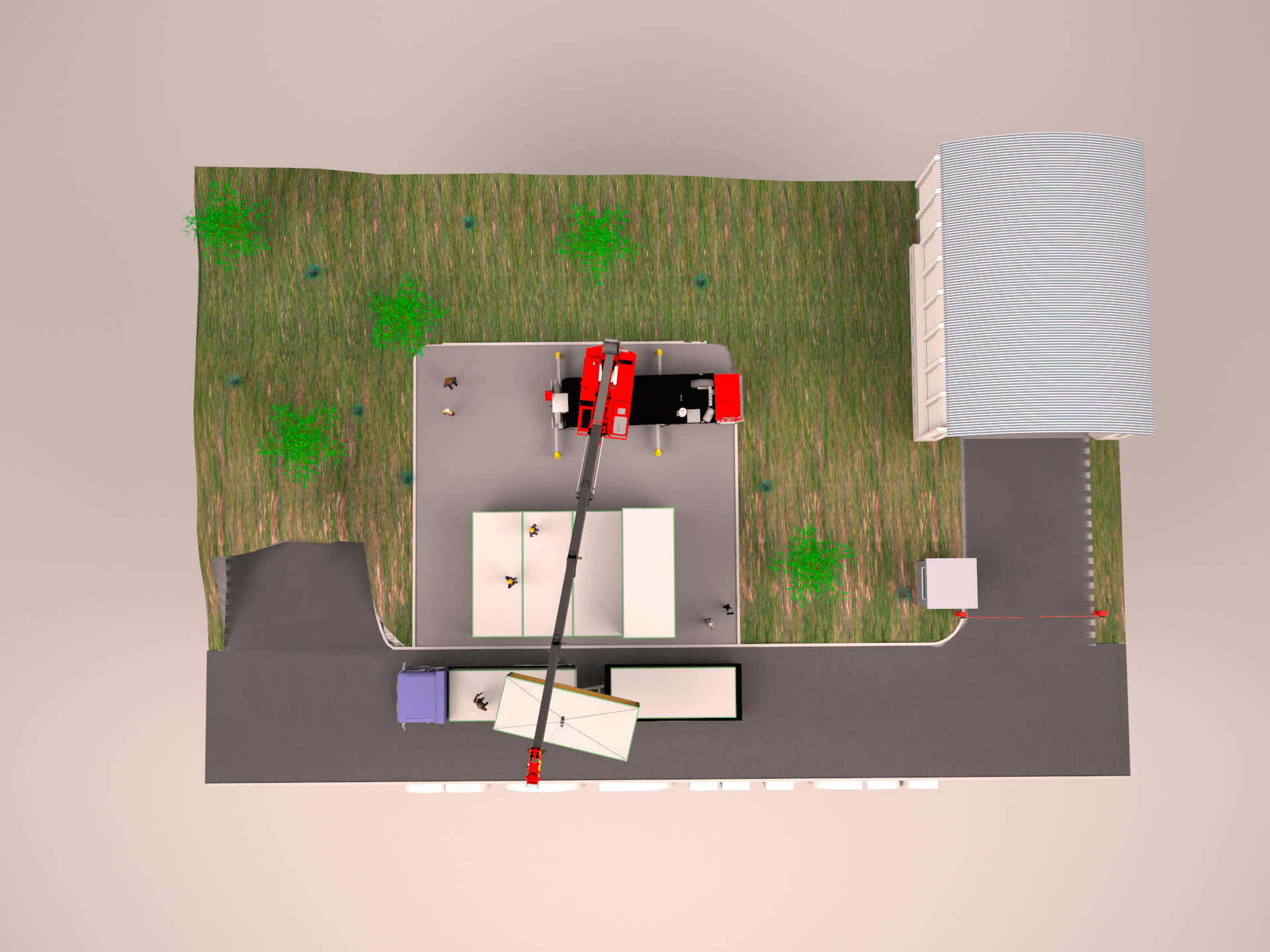 4. Кран снимает с автомобиля модули и строит из них здание(здание 2-х этажное, 4 модуля первый этаж и 4 второй этаж. Возможно упростить разборку модуля в момент захвата и поднятия его краном так, что бы это было технологичеки возможным. Так же возможно изменить ориентацию самого здания и крана так, что бы это было возможно технологически исполнить)