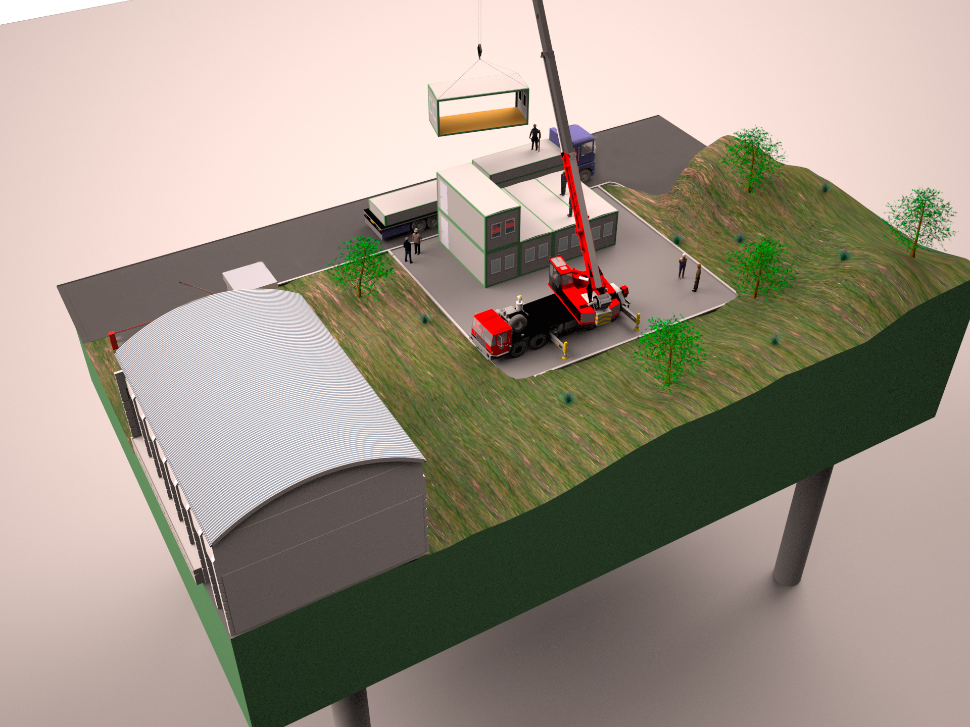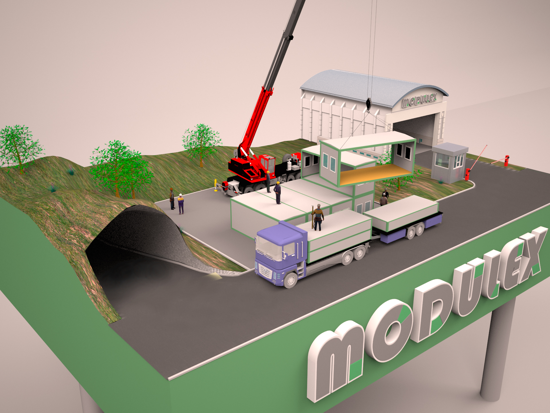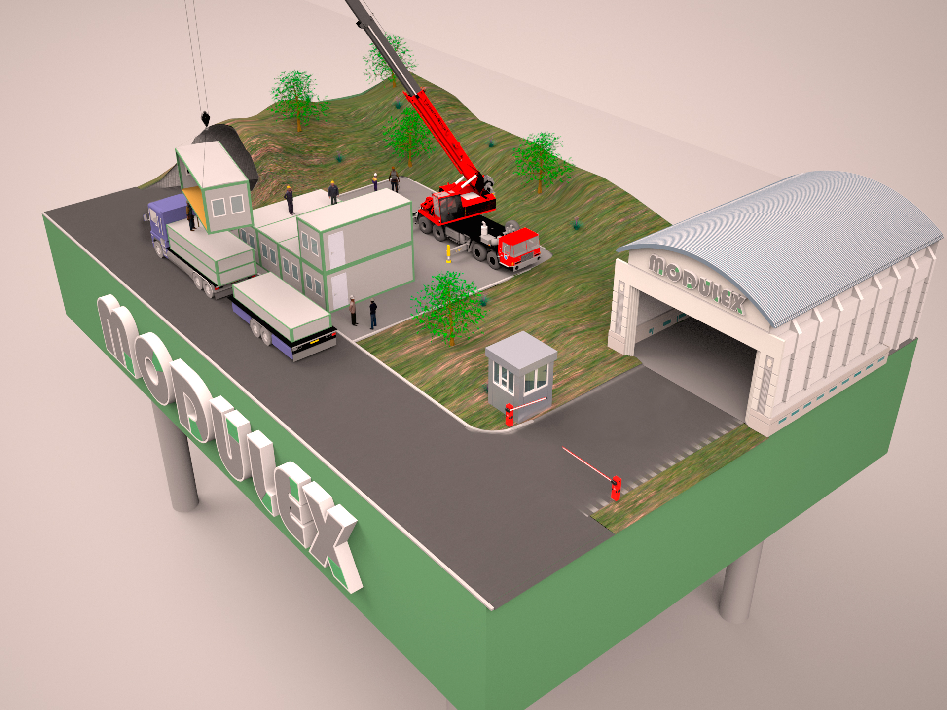 1. Открывается ангар из которого выезжает грузовой автомобиль с погруженными на него 8ю модулями. Автомобиль с прицепом как на визуализации.