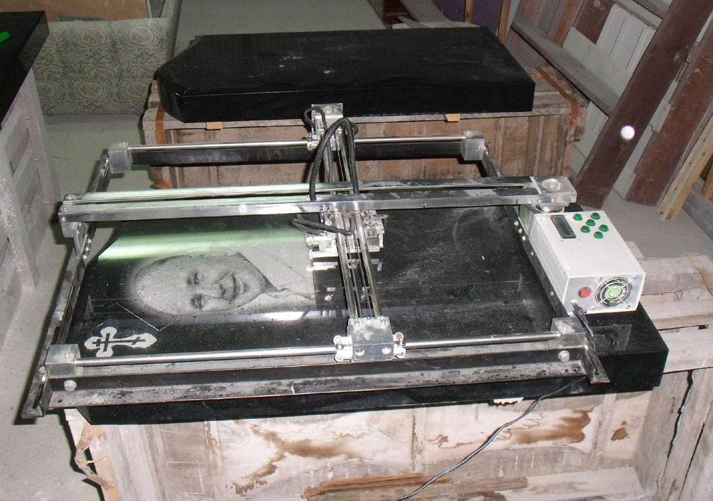 ), которому приносят фото или картинку, он ее обрабатывает, набирает таких картинок жменьку, пишет на флешку. За флешкой приходит другой оператор - станка (в робе и в пылюке), идет в другое помещение, где стоит станок, вставляет туда флешку, неким образом выбирает нужный файл и станок выбивает его в камне. Если не хочется заморачиваться с поддержкой нескольких файлов и интерфейсом их выбора - пусть файл будет один, оператор в робе не сломается раз в 2 часа сбегать за новым. Тогда HMI будет состоять из кнопки "Пуск" на станке