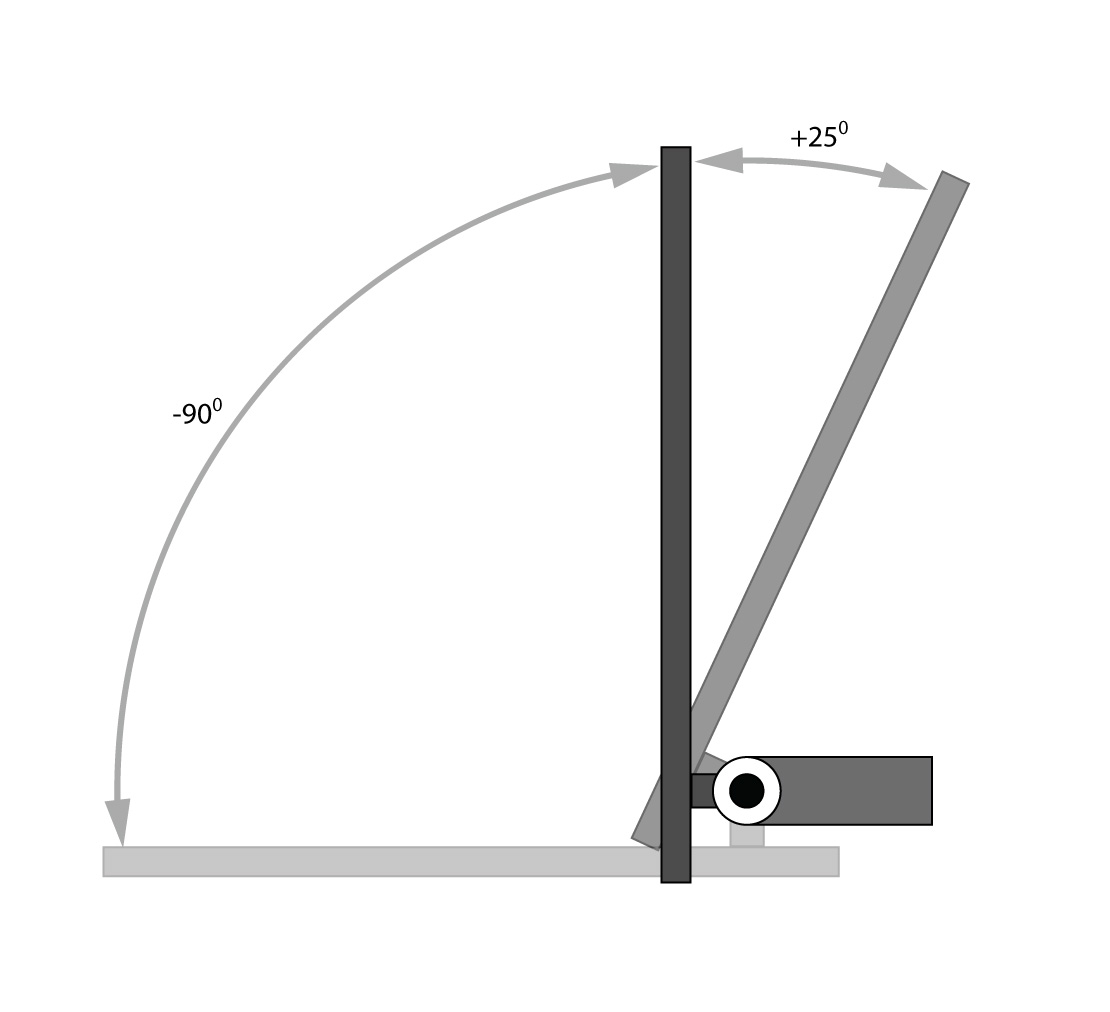 В секторе -90 град. поворотная часть может занять только крайнее, горизонтальное, положение. После выхода из этого положения поворотная часть должна занять выбранное последнее положение в секторе +25 град.