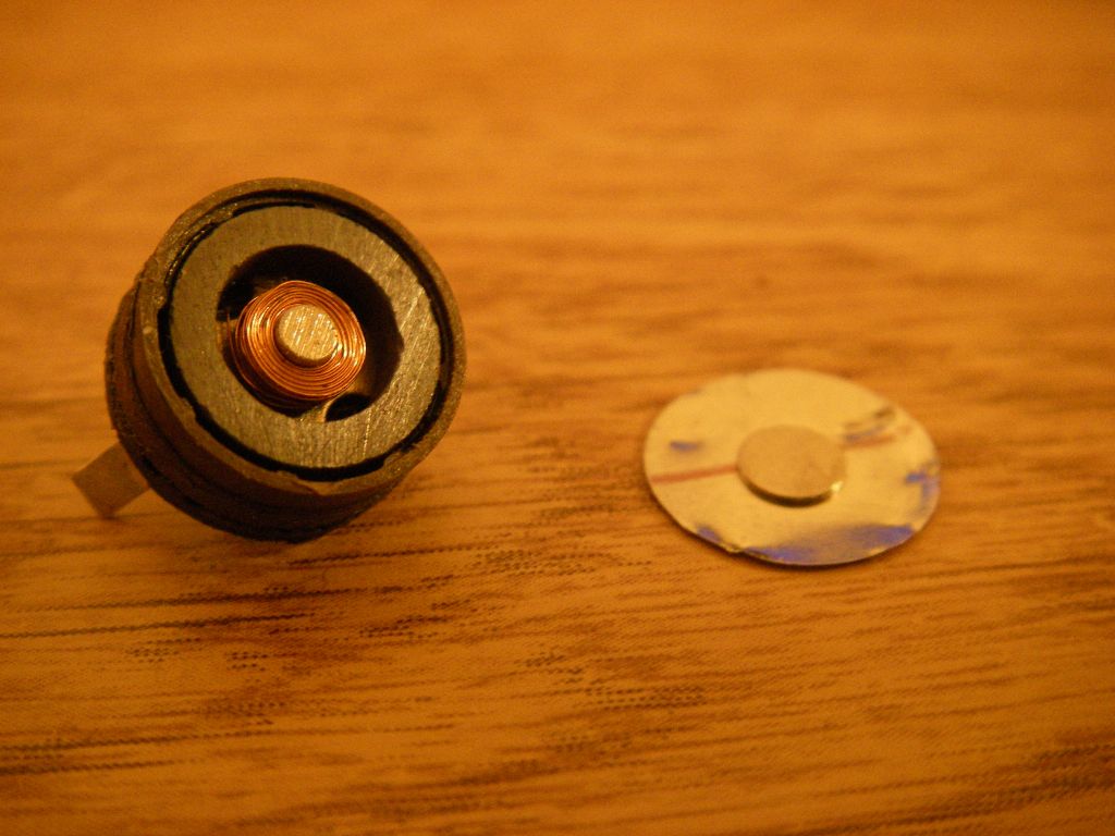 Пришел домой, подрубил напрямую к контроллеру, быстренько накатал программку-пищалку. Благо в спецификации на один из динамиков резонансная частота сказана. Второй тем временем любопытства ради был разобран(и с целью оценки извлекаемости пьезоэлемента). И каково же было мое удивление, когда я увидел как оно сделано: