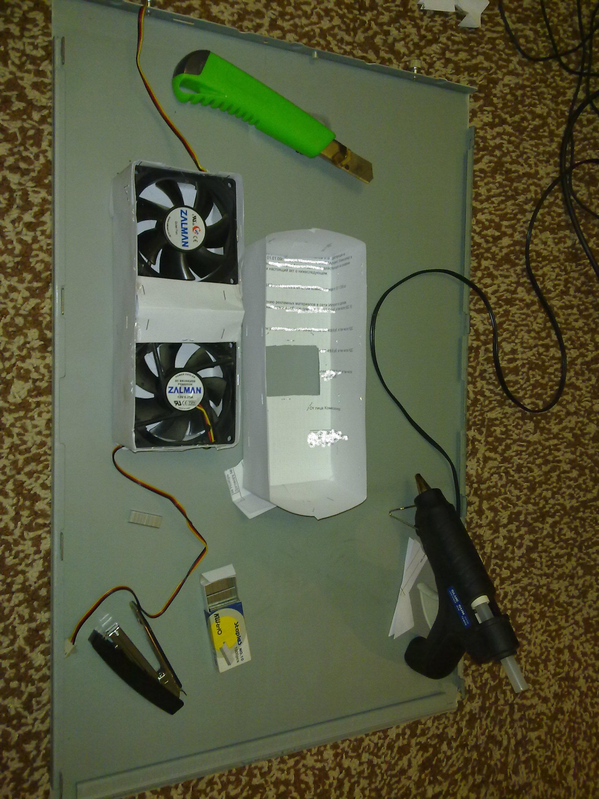 в эту коробочку вклеиваем 2 кулера с зазором 2 см так чтобы один дул внутрь коробочки, а второй наружу