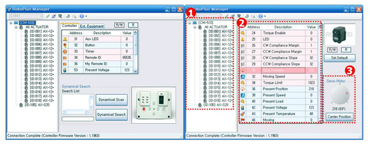 Увесистая коробка содержит внутри два яруса и расположенные сверху инструкцию по эксплуатации, диск с программным обеспечением от Robotis и листочек c кратким описанием по Dynamixel. На верхнем ярусе расположены два отсека с сервомоторчиками Dynamixel , джойстик для дистанционного управления, корпусные детали, контроллер СМ-510, а также интерфейсные и зарядные кабели.