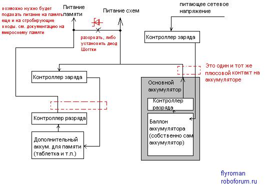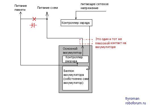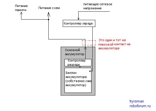 НО...но подумав еще чуть чуть, вспомнил, если по этой схеме делать, то при разрядке аккумулятора до определенного порога(робот долго работал), контроллер разряда отключит аккумулятор от цепи, ЧТО ПОВЛЕЧЕТ ЗА СОБОЙ ПОТЕРЮ ПАМЯТИ. , а нам этого не надо.